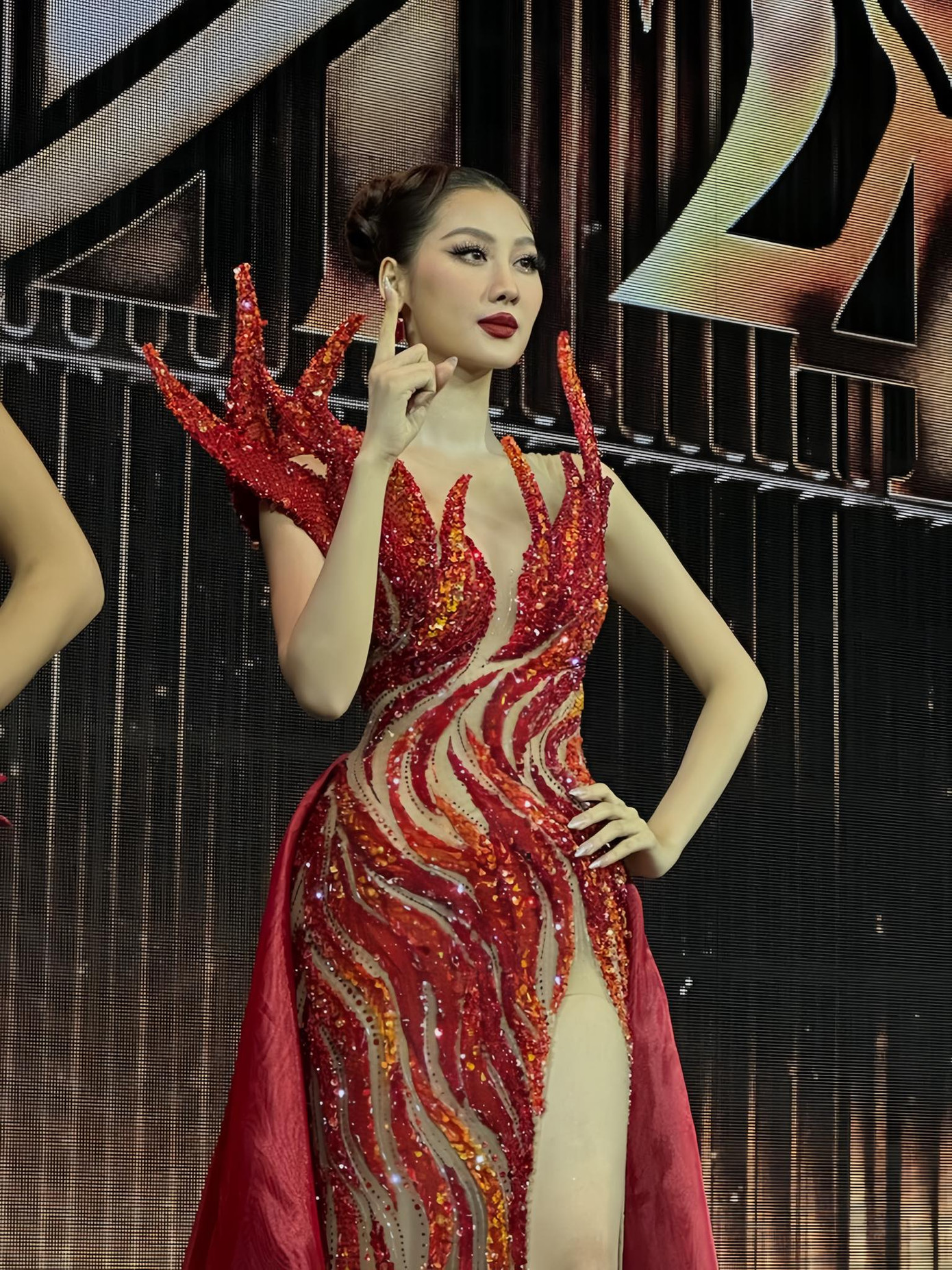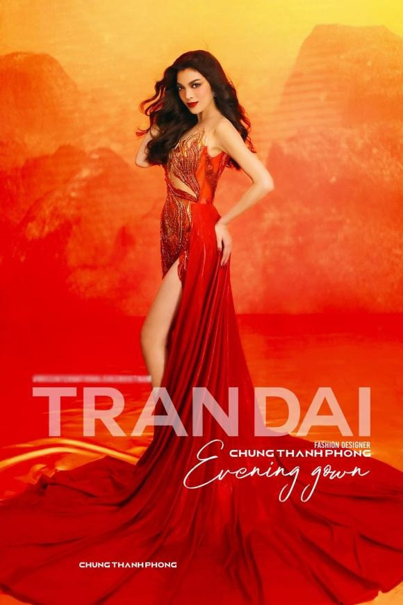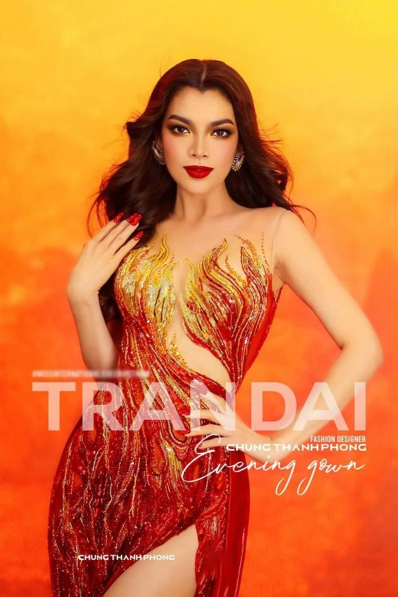 Đại diện Việt Nam mặc một bộ váy màu đỏ rực rỡ được NTK Nguyễn Minh Tuấn lấy cảm hứng sức mạnh và sự kiêu hãnh bừng sáng lên từ tro tàn. Những đường uốn lượn đính kim sa đỏ trên nền vải voan khiến mọi người liên tưởng đến ngọn lửa đang bùng cháy.