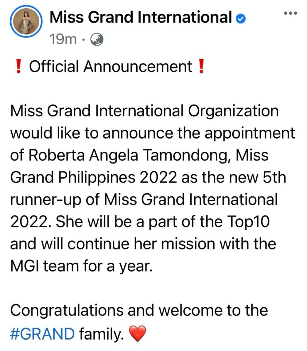 Và mới đây, BTC Miss Grand International đã chính thức thông báo trên fanpage sẽ lựa chọn đại diện đến từ Philippines, Roberta Angela Tamondong thay thế cho Hoa hậu Hòa bình Mauritius trong Top 10 năm nay. Phản ứng trước thông tin này, fan Việt tỏ ra rất lịch sự khi không ít người đã gửi lời chúc mừng tới đại diện Philippines.
