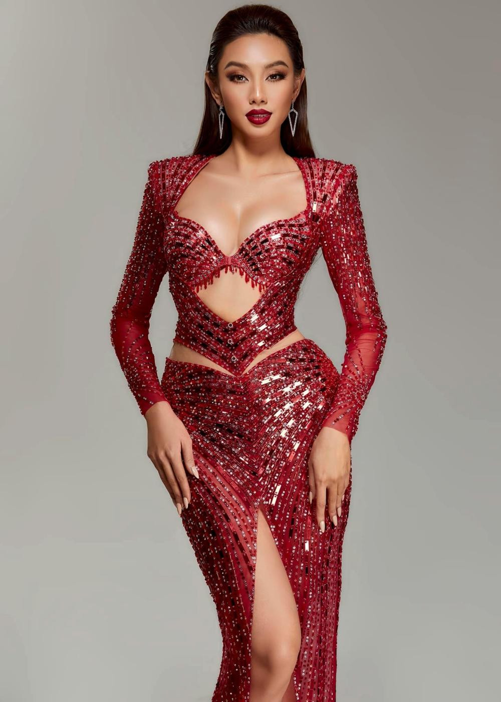 Thiết kế mới vẫn là một sản phẩm của NTK Nguyễn Minh Tuấn, có tên Red Diamond Gown, lấy cảm hứng từ những viên kim cương, đính kết trên nền vải đỏ thẫm, mang đến cho người đẹp Thùy Tiên sự sang trọng và quyền lực.