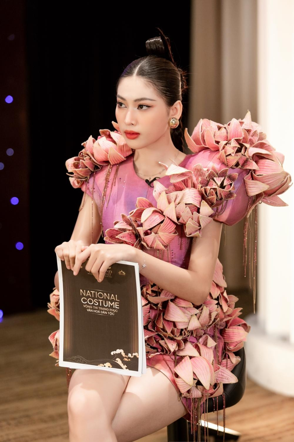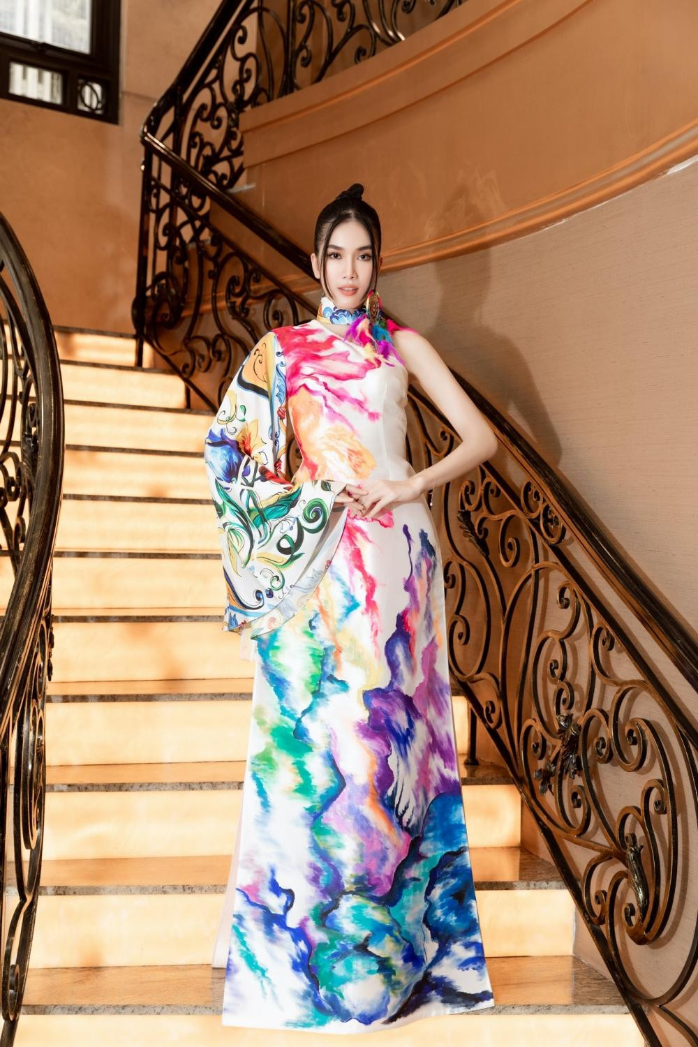Á hậu Phương Anh đảm nhận vai trò host, người đẹp mặc mẫu áo dài cách điệu, rực rỡ nhiều màu sắc, mang đậm tính nghệ thuật.