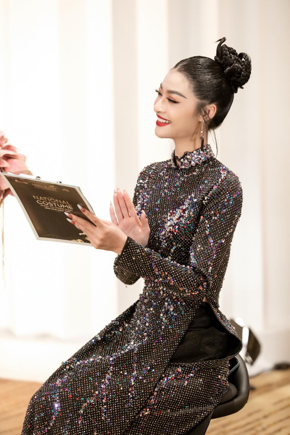 Á hậu Kiều Loan sang trọng với mẫu áo dài đen lấp lánh.