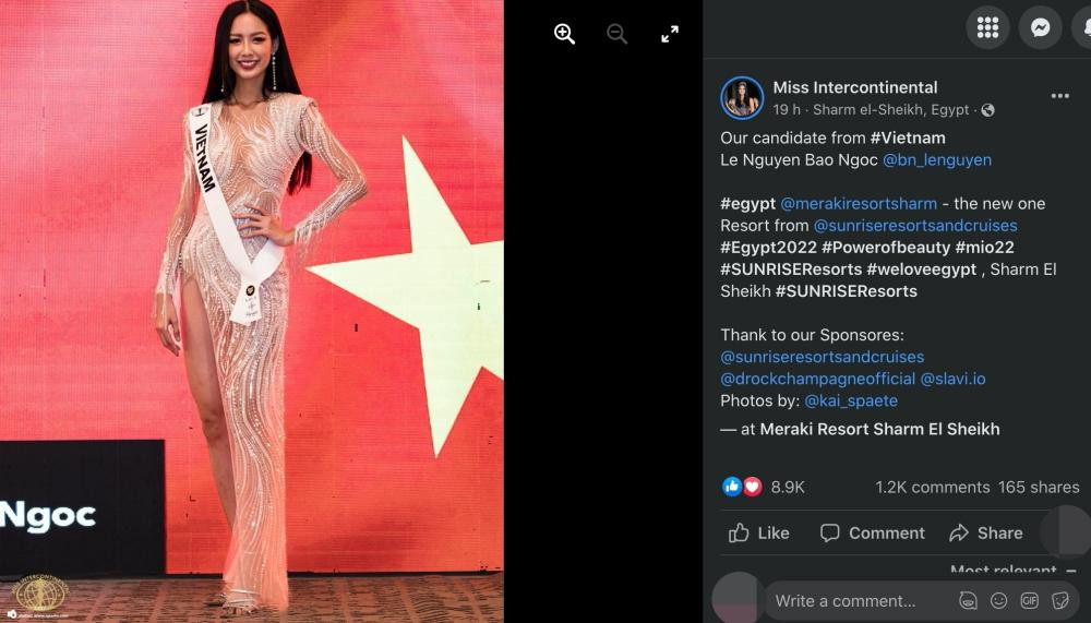Hình ảnh nhận sash của Á hậu Bảo Ngọc mới đây đã chính thức được trang chủ cuộc thi Miss Intercontinental đăng tải, cô là một trong số ít các người đẹp nhận được lượng tương tác khủng từ người hâm mộ.