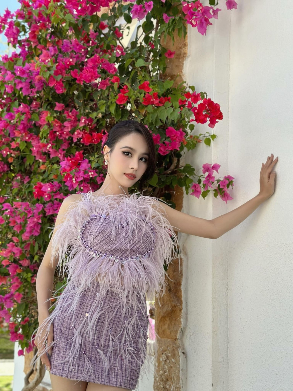 Tới Ai Cập, Ngọc Hằng chuyển sang một bộ váy ngắn khác màu tím nhạt, đính hoa cầu kỳ.
