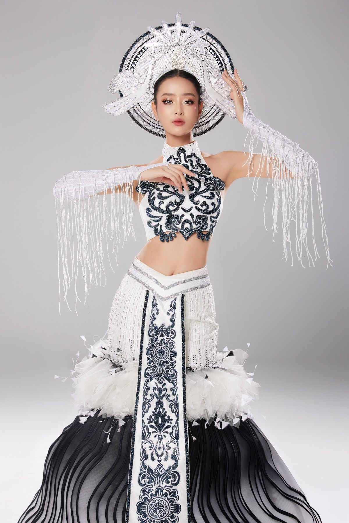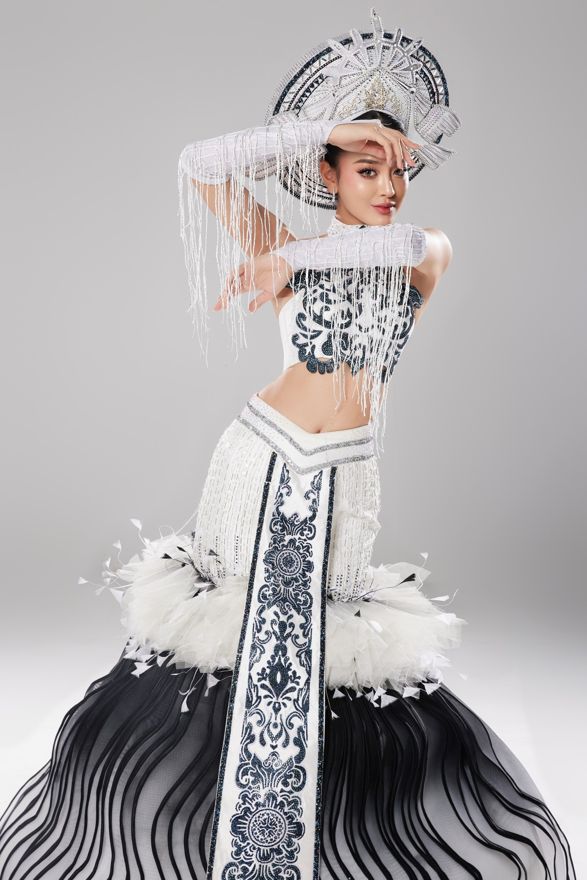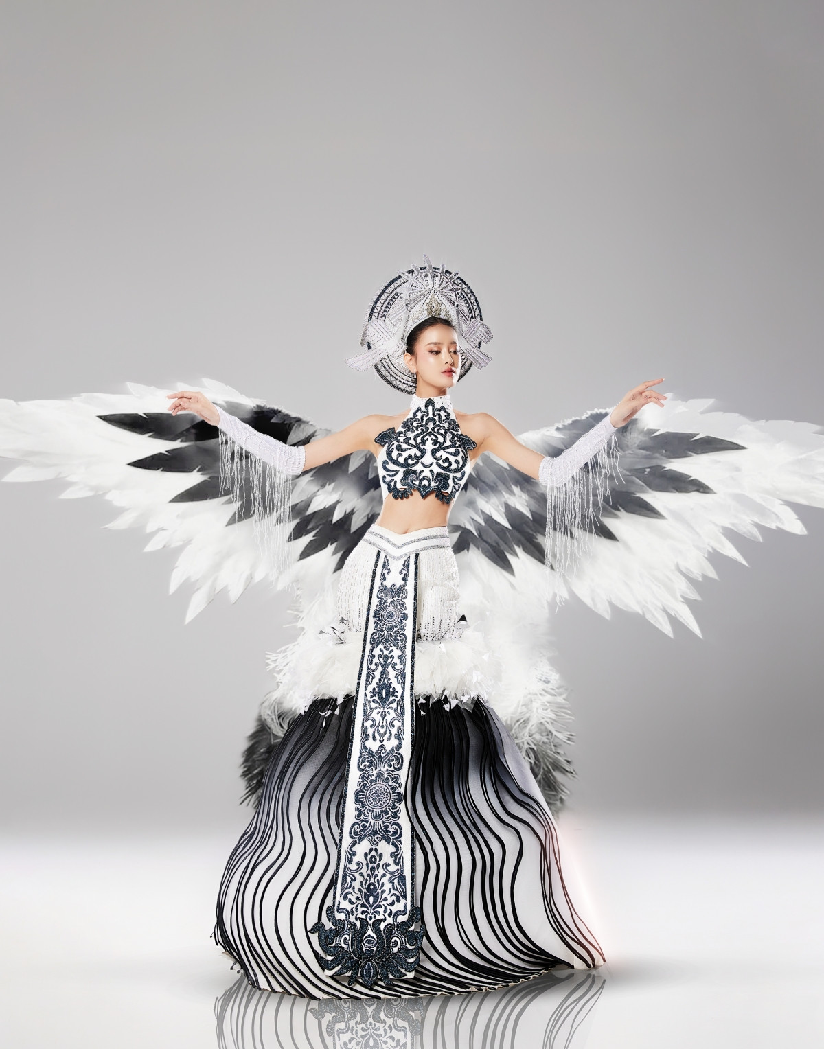 Từ lâu, chim hạc đã là hình ảnh quen thuộc, mang nhiều tầng ý nghĩa sâu sắc. Loài chim này biểu tượng cho sự trường thọ, bất tử. Chưa kể khả năng bay cao, bay xa của chim còn là biểu tượng cho sự vĩnh cửu, bứt phá giới hạn. Thông qua đó, nhà thiết kế gửi gắm thông điệp về sự vượt qua những rào cản để chinh phục vương miện Miss Intercontinental 2024 của Bùi Khánh Linh.