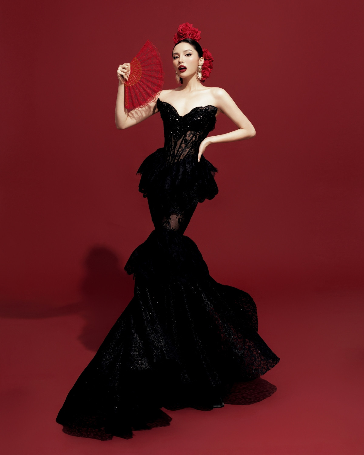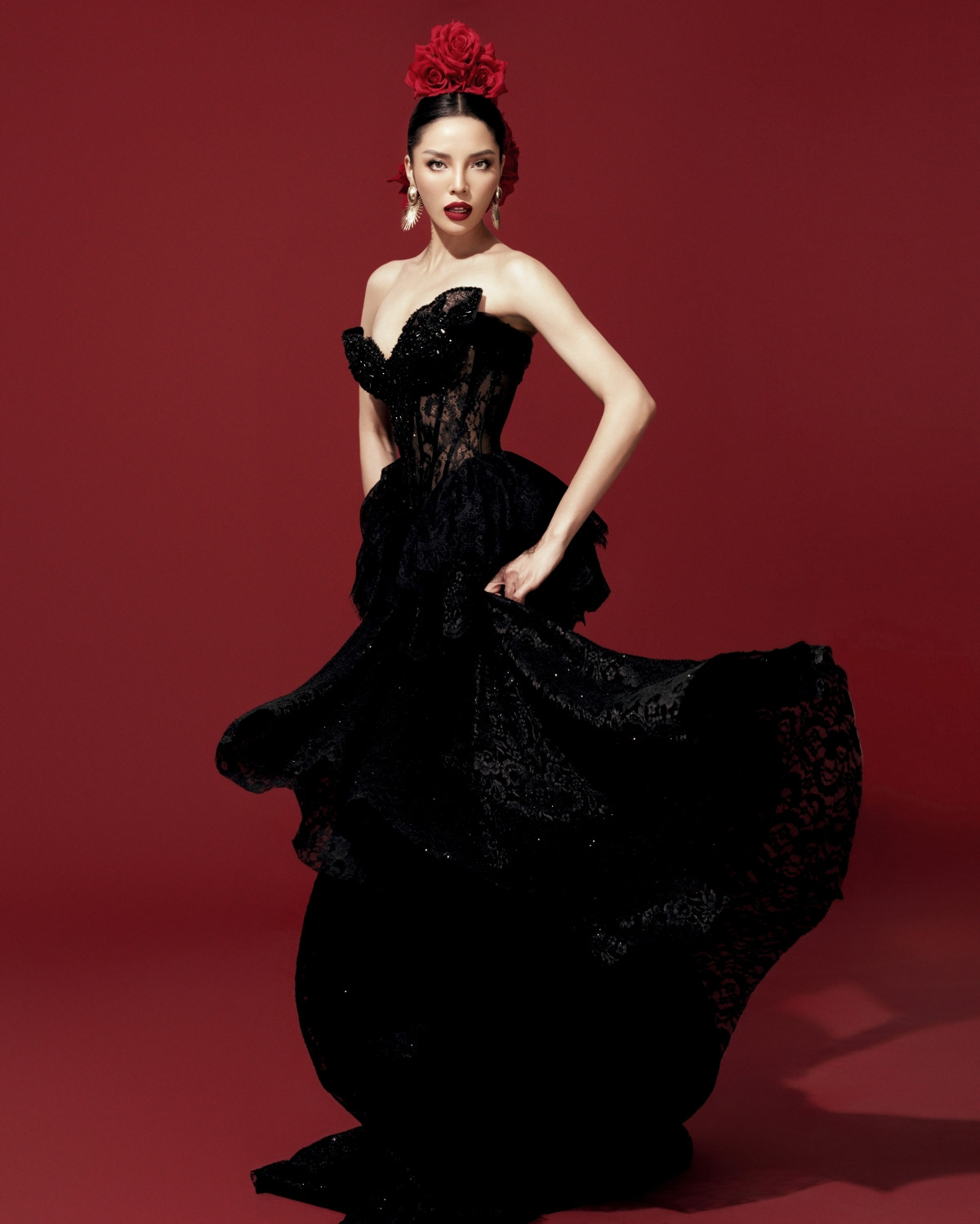 Ngay khi đặt chân tới Mexico, Kỳ Duyên đã chọn mặc bộ áo dài rất “Mexico” ở chi tiết lệch vai, ống tay áo xòe rộng nhiều lớp, cộng thêm hoa cài tóc to bản, cài một bên, mang đậm phong cách truyền thống của Mexico.