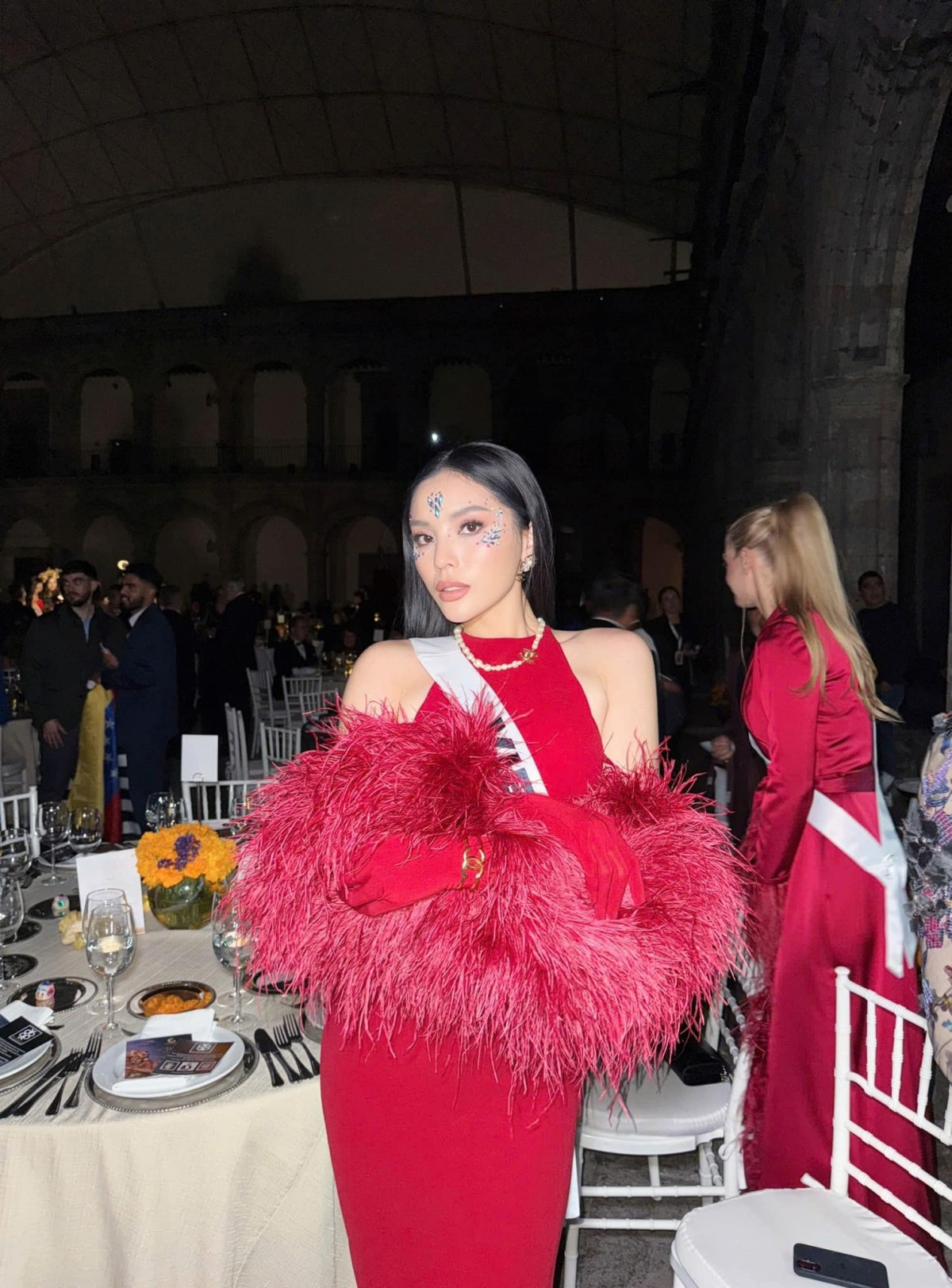Kỳ Duyên tiếp tục mặc thiết kế dạ hội màu đỏ trong tiệc tối, người đẹp có cơ hội được chụp ảnh cùng một trong những người sở hữu tổ chức Miss Universe, bà Anne Jakrajutatip, CEO của tập đoàn JKN Global Group có trụ sở chính ở Thái Lan.