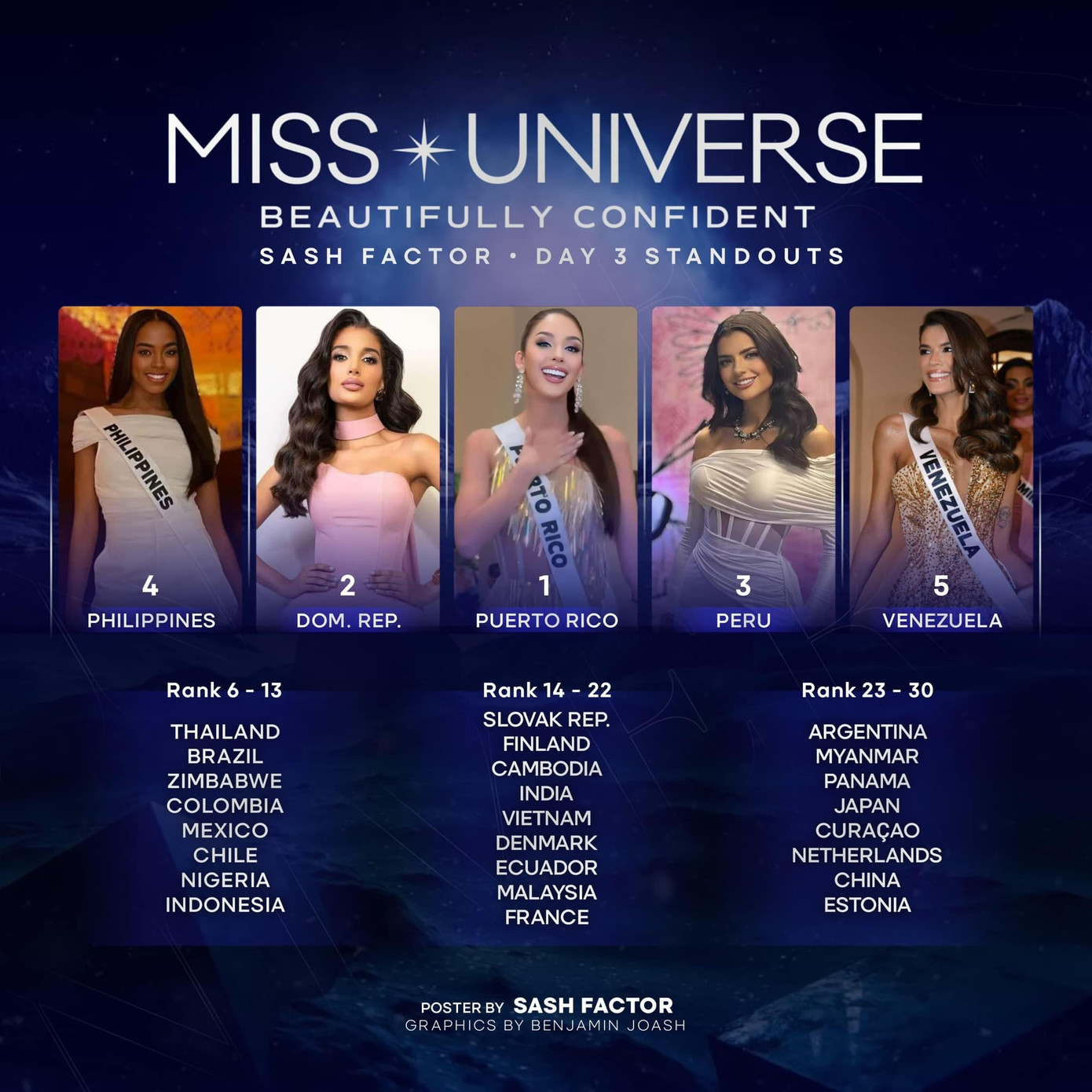 Trong khi đó, đại diện Thái Lan lại trượt dốc từ vị trí đầu bảng ngày thứ 2 xuống số 6 của ngày hôm sau. Việc các thí sinh thay đổi thứ hạng liên tục cho thấy cuộc cạnh tranh ở Miss Universe 2024 vô cùng căng thẳng, ai cũng cố gắng hết sức để có được diện mạo ấn tượng, tỏa sáng nhất.