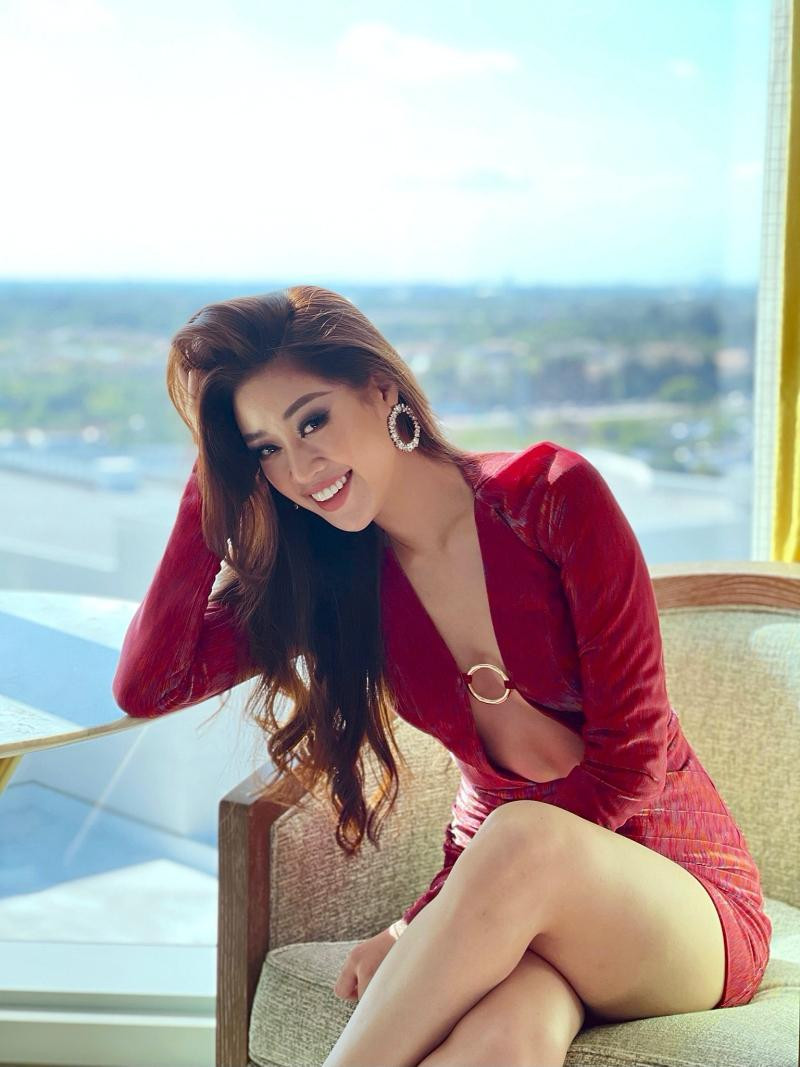 Hôm nay Hoa hậu Khánh Vân chọn một thiết kế váy ngắn ôm sát, màu đỏ sẫm nổi bật. Không chỉ khoe đôi chân thon dài, thiết kế này còn có phần cắt xẻ ngay phía trước ngực và cơ bụng.