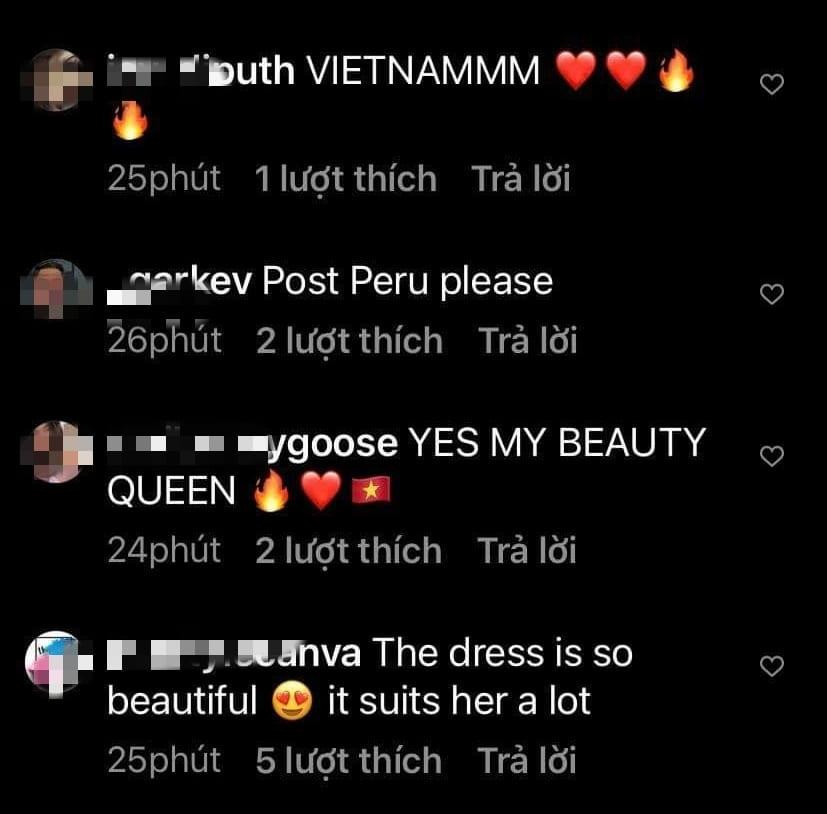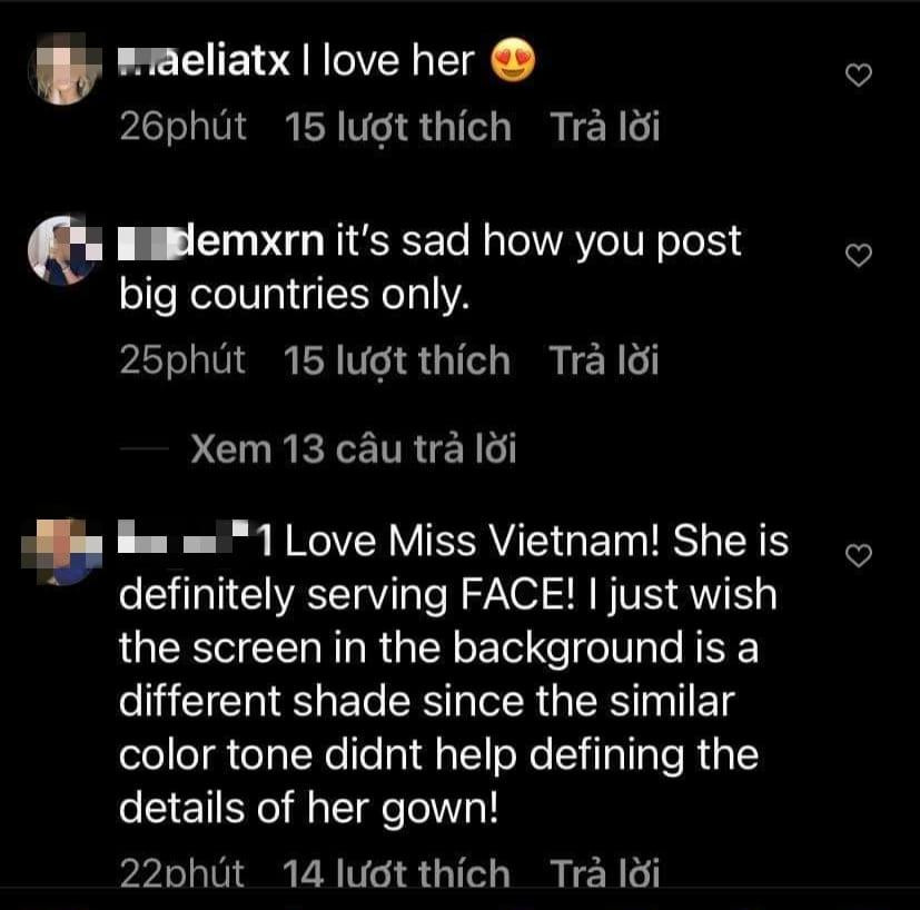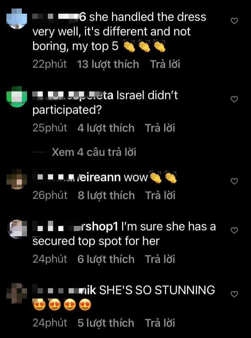 Những lời khen có cánh dành cho Khánh Vân ngày càng xuất hiện nhiều hơn như: “Cô ấy (Miss Vietnam) thực sự đốt cháy sân khấu”/ “Đẳng cấp và sắc sảo”, “Tôi rất yêu Miss Việt Nam”/ “Tôi chắc chắn cô ấy sẽ vào sâu hơn nữa”/ “Chiếc váy dạ hội thật sự rất đẹp”...