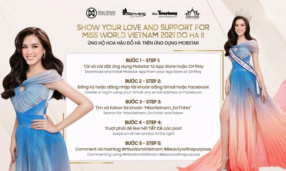 Ngay từ bây giờ, bạn có thể download ứng dụng bình chọn chính thức của cuộc thi Miss World 2021 là Mobstar trên điện thoại di động, sau đó tìm tài khoản của Hoa hậu Đỗ Thị Hà là MissVietnam_DoThiHa, nhấn follow và tương tác với các bài đăng của nàng hậu để bình chọn cho đại diện Việt Nam. Nhận được bình chọn càng nhiều, sẽ càng giúp Hoa hậu Đỗ Thị Hà có thêm cơ hội lọt vào vòng trong của cuộc thi, tiến gần hơn tới chiếc vương miện danh giá.