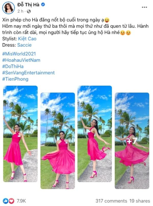 Ngày thứ 3 tham gia Miss World 2021, Hoa hậu Đỗ Thị Hà khoe tới 3 bộ váy lụa với màu sắc vô cùng nổi bật. Người đẹp tỏ ra vô cùng vui vẻ khi đăng bộ ảnh thứ 3: "Xin phép cho Hà đăng nốt bộ cuối trong ngày ạ! Hôm nay mới ngày thứ ba thôi mà mọi thứ như đã quen từ lâu. Hành trình còn rất dài, mọi người hãy tiếp tục ủng hộ Hà nhé!"
