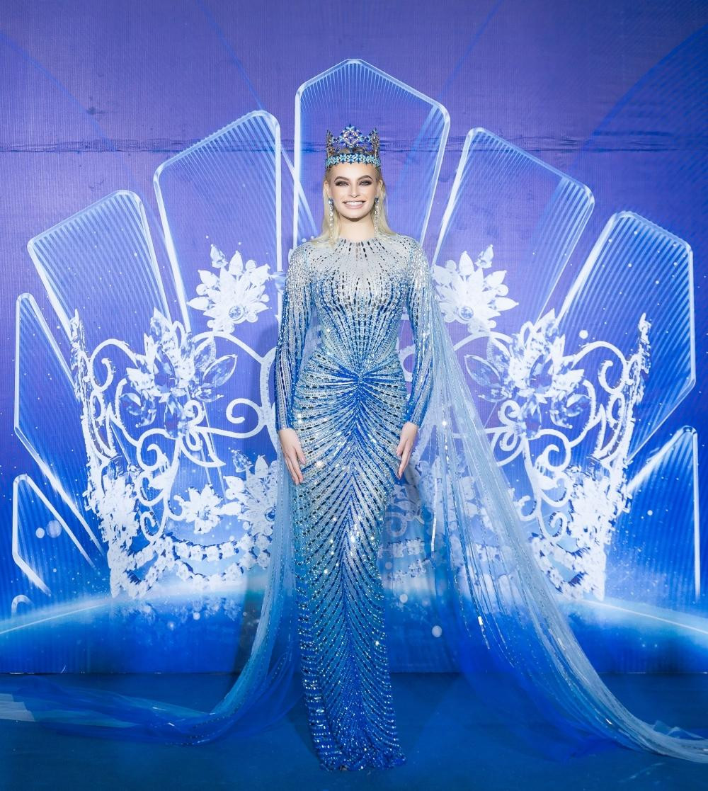 Đương kim Miss World 2021 Karolina Bielawska diện thiết kế màu xanh ôm sát, khoe sắc vóc đỉnh cao của beauty queen thế giới. Nàng hậu xinh đẹp như một "nữ thần biển cả".