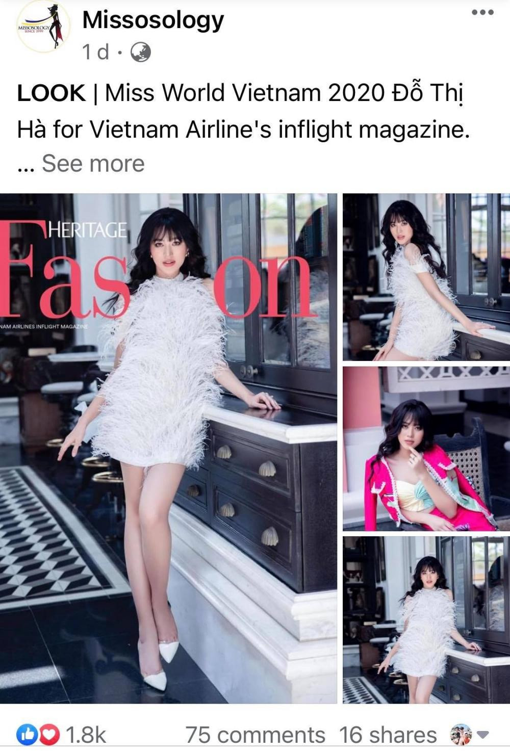 Bài đăng về bộ ảnh thời trang mới nhất của Hoa hậu Đỗ Thị Hà là post đầu tiên của Missosology sau các post về cuộc thi Miss Universe lần thứ 69. Chuyên trang này giới thiệu: Miss World Vietnam 2020 Đỗ Thị Hà chụp ảnh cho tạp chí trên chuyến bay của hãng hàng không Vietnam Airlines, kèm theo đó là những bức ảnh xinh đẹp của Hoa hậu Đỗ Thị Hà.