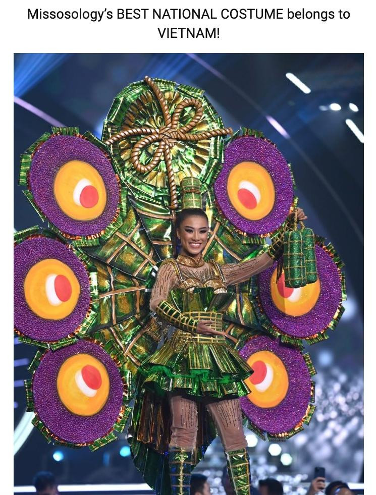 Vị trí số 1 của BXH Top 10 Trang phục Dân tộc đẹp nhất theo Missosology thuộc về bộ trang phục “Ai Tét Hônggg?” của đại diện Việt Nam, Á hậu Nguyễn Huỳnh Kim Duyên. Thiết kế xuất sắc lấy cảm hứng từ món ăn truyền thống Bánh Tét Lá Cẩm của người Cần Thơ, quê hương của Á hậu Kim Duyên: Món bánh dân dã, gọn gàng mà chắc bụng. Món bánh đơn sơ mà nuôi nấng dân lành qua bao nhiêu thế hệ!