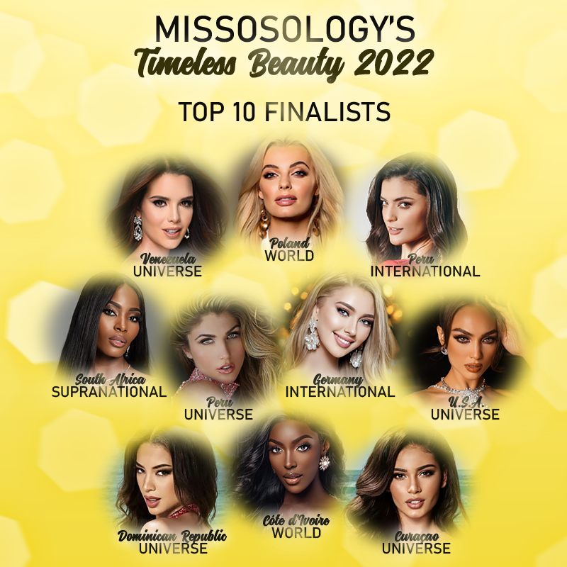 Top 10 của Timeless Beauty 2022 năm nay không có một đại diện nào đến từ châu Á, và không có một đại diện nào đến từ cuộc thi Miss Earth, kể cả đương kim Hoa hậu. Top 10 đa số đến từ hai cuộc thi sắc đẹp lớn nhất là Miss World và Miss Universe, gồm những người đẹp sau (được xếp theo thứ tự ngẫu nhiên):