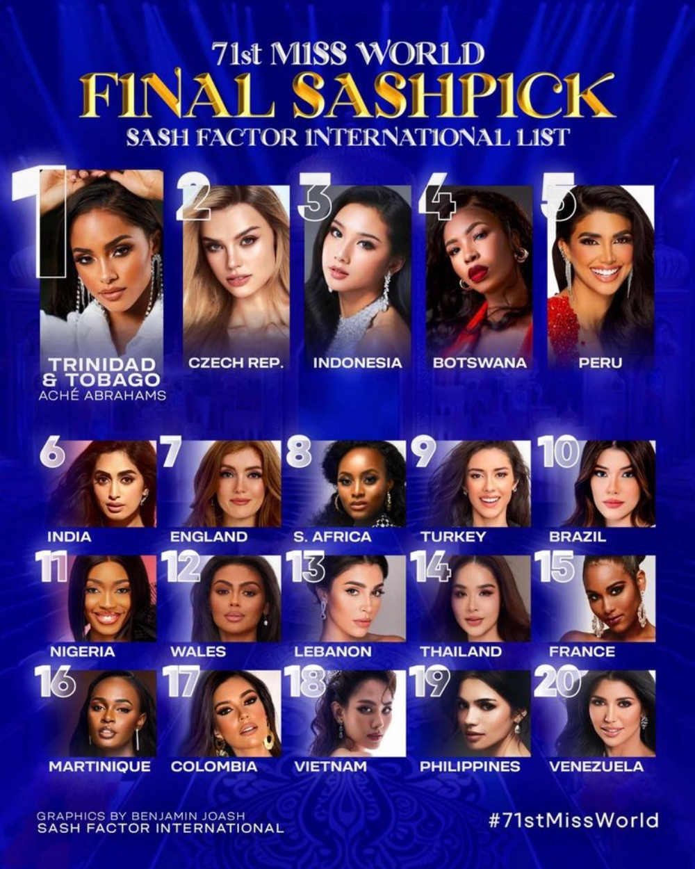 Với chuyên trang Sash Factor, người đẹp được dự đoán giành vương miện lại là Hoa hậu Trinidad và Tobago, Hoa hậu Cộng hòa Séc giành vị trí Á hậu, Hoa hậu Indonesia đại diện châu Á và châu Đại Dương giành vị trí thứ 3, vị trí thứ 4 là Hoa hậu Botswana. Đáng chú ý, Sash Factor dự đoán Hoa hậu Mai Phương có thể được xếp ở vị trí thứ 18.