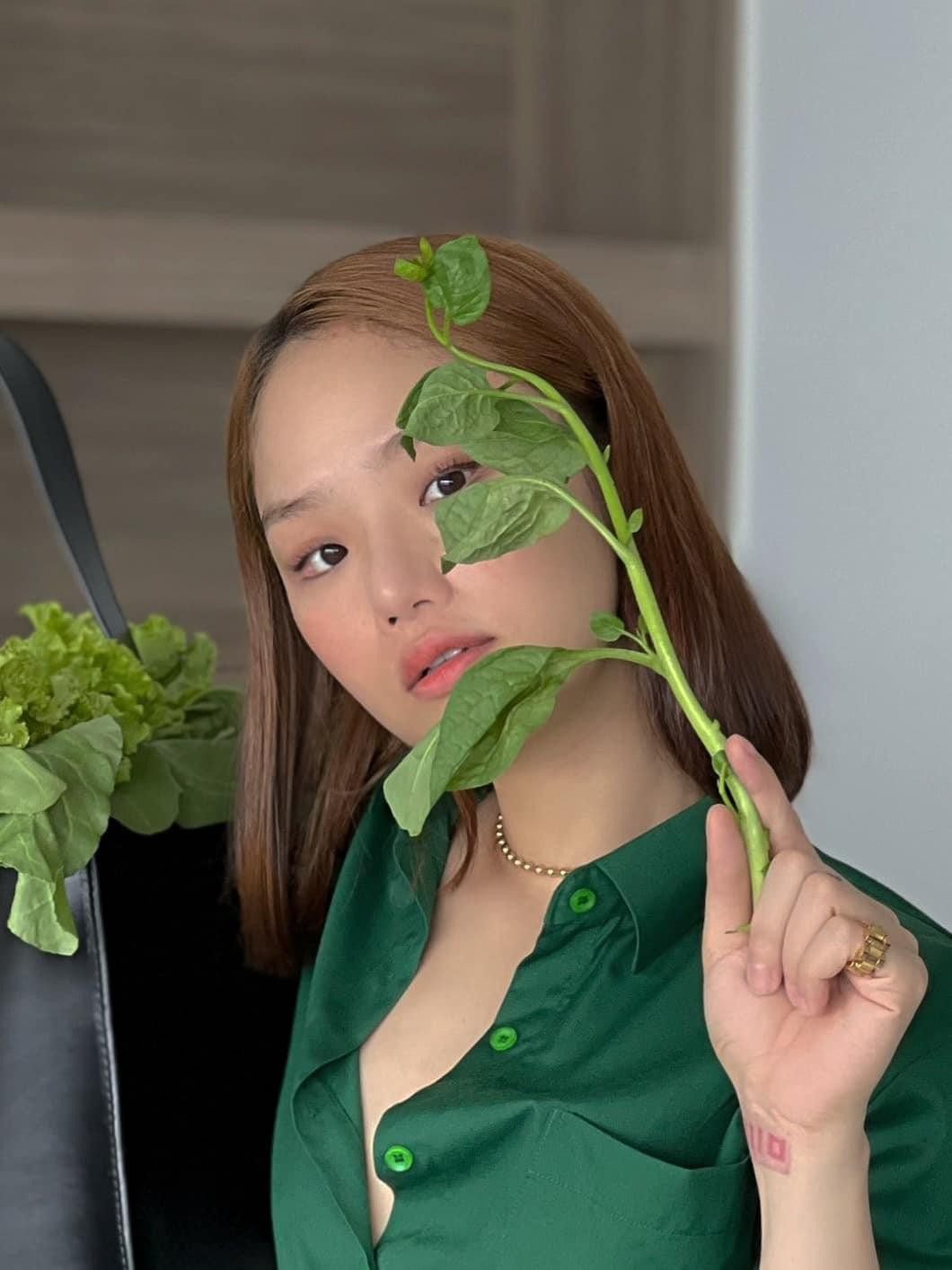 Cụ thể, giọng ca Giá như cô ấy chưa xuất hiện hài hước với dòng caption: “Miss Mồng Tơi 2021” và loạt ảnh không thể thiếu “đạo cụ” có 1-0-2 này. Có lẽ, giỏ rau xanh là lương thực “tiếp tế” cho Miu Lê trong những ngày TP.HCM giãn cách xã hội và cô nàng đã tận dụng triệt để cho ra đời loạt ảnh trước khi “em ăn không còn một cọng”.