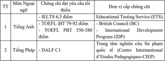 Riêng đối với phương thức xét tuyển chứng chỉ tiếng Anh và tiếng Pháp quốc tế, chứng chỉ phải có giá trị sử dụng ít nhất đến ngành 15/5/2021 (ngày nộp hồ sơ dự kiến của trường) và đạt mức điểm tối thiểu theo bảng dưới đây: