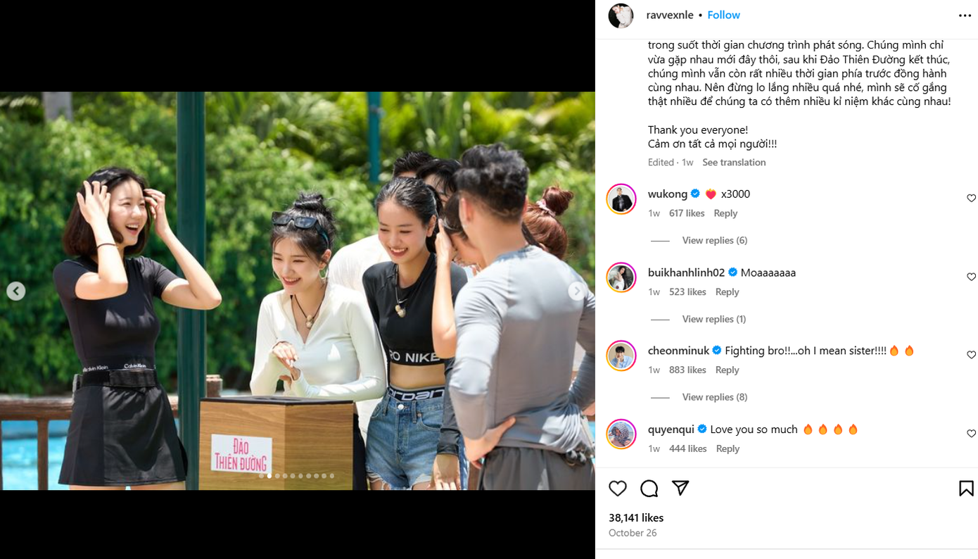 Kết thúc show hẹn hò, dàn cast nam Đảo Thiên Đường duy trì trạng thái theo dõi nhau trên Instgram. Minuk và Michael Trương trở nên thân thiết hơn, đăng tải nhiều content cùng nhau. Trong khi I Eon, Wukong không có nhiều tương tác đáng chú ý với Michael Trương hậu drama "loại người".