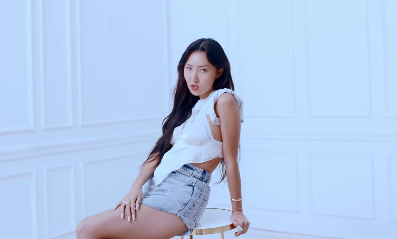 Hóa ra Hwasa cũng từng diện chiếc áo này và còn có phần phá cách hơn Rosé. Thành viên nhóm Mamamoo còn cuộn tròn tay áo lên để khoe lưng trần nhiều hơn.