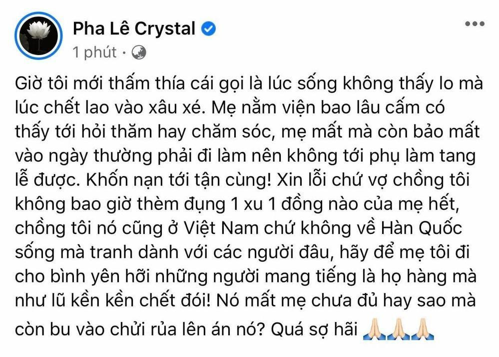 Sau đó vài ngày, Pha Lê lại có một bài đăng rất gay gắt chỉ trích người thân bên gia đình mẹ chồng. Nữ ca sĩ tiết lộ họ hàng bên chồng không ngó ngàng chăm sóc khi mẹ chồng cô đau ốm bệnh tật nhưng khi bà qua đời lại lao vào tranh giành tiền bạc thừa kế. Pha Lê cũng khẳng định hai vợ chồng cô không hề động vào tiền mẹ để lại, cũng không có ý định tranh giành tiền bạc với họ hàng bên chồng.