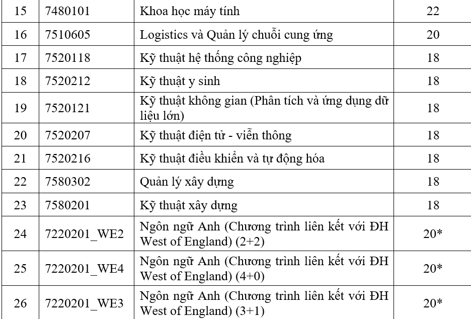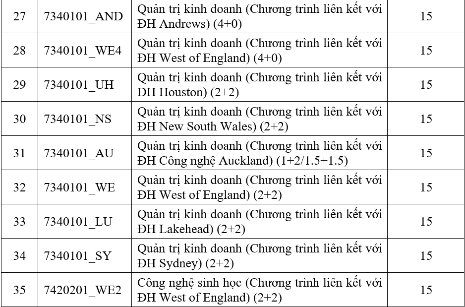 Trong khi đó, một số ngành đào tạo liên kết với các đối tác của nhà trường có điểm sàn thấp nhất với 15 điểm. Đặc biệt, ngành Ngôn ngữ Anh có mức điểm sàn là 24, tính theo thang điểm 40 với điểm môn tiếng Anh được nhân hệ số 2.