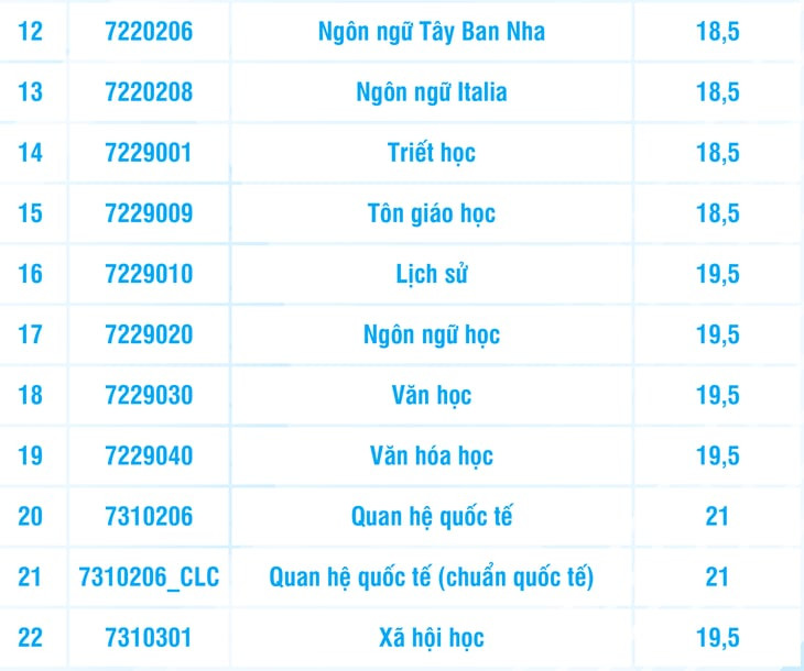Đáng chú ý, các ngành có mức điểm sàn cao nhất đều là những ngành “hot”, gồm: Báo chí, Truyền thông đa phương tiện, Quan hệ quốc tế, Tâm lý học, Ngôn ngữ anh, Quản trị dịch vụ du lịch và lữ hành. Ở những ngành này, nhà trường áp mức điểm sàn chung cho cả chương trình đại trà và chương trình chuẩn quốc tế.