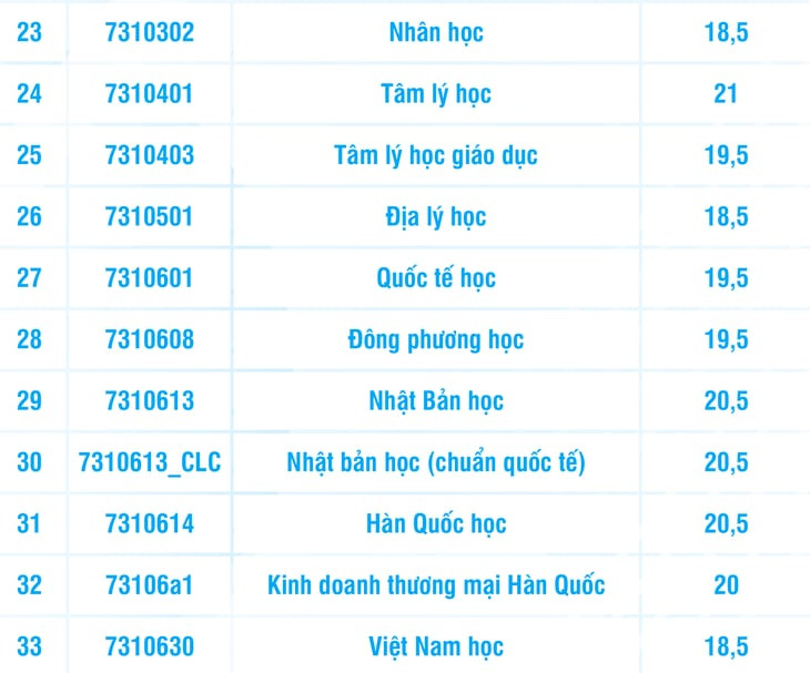Bên cạnh đó, ba ngành học mới của trường là Kinh doanh thương mại Hàn Quốc có mức điểm sàn là 20 điểm; Quốc tế học và Nghệ thuật học có cùng mức sàn là 19,5 điểm.