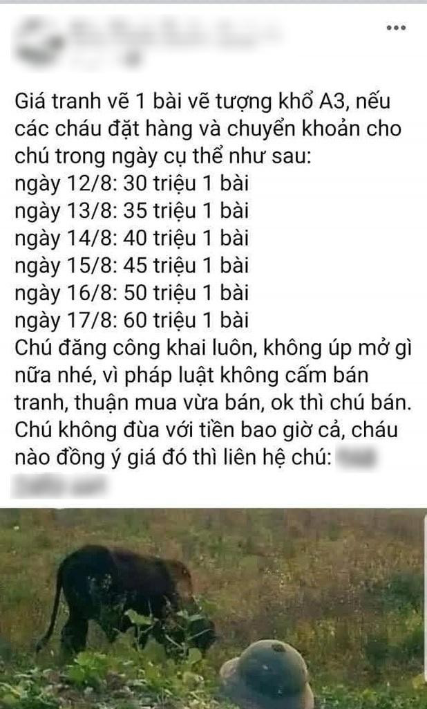 Thậm chí, trên trang cá nhân người còn công khai giá của các bức tranh trong từng ngày. Càng gần ngày thi thì giá càng cao, mỗi ngày tăng thêm từ 5 - 10 triệu đồng. Cụ thể ngày 12/8 giá 30 triệu đồng/ bài, đến ngày 17/8 lên tới 60 triệu đồng/ bài.