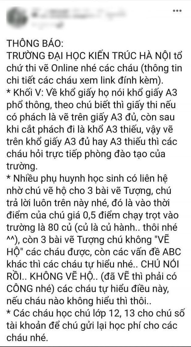 Mới đây, trên mạng xã hội xuất hiện những bài đăng của tài khoản Facebook tự nhận là thầy giáo dạy vẽ ở Hà Nội, trình độ thạc sĩ, chào mời các thí sinh mua tranh ngay trước kỳ thi năng khiếu của Đại học Kiến trúc Hà Nội khiến dân mạng xôn xao.