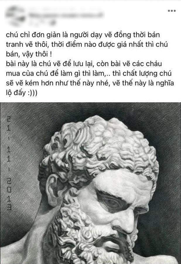 Tài khoản này còn thường xuyên đăng những bức vẽ của mình và khẳng định: "Chú đơn giản là người dạy vẽ đồng thời bán tranh vẽ thôi. Thời điểm nào được giá nhất thì chú bán. Bài này chú vẽ để lưu lại, còn bài vẽ các cháu mua của chú thì chất lượng vẽ sẽ kém hơn như thế này, vẽ thế này là nghĩa lộ đấy".