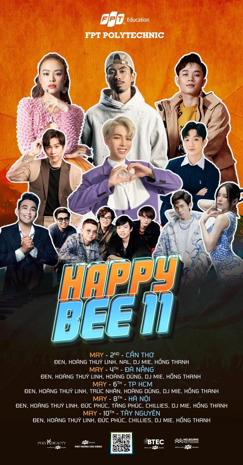 Không để các bạn sinh viên phải thất vọng, đại nhạc hội Happy Bee 11 năm nay sẽ có sự tham gia của Đen - chàng rapper quốc dân, ca sĩ Hoàng Thùy Linh, Trúc Nhân, Đức Phúc, Hoàng Dũng, Tăng Phúc, nhóm nhạc Chillies, Hồ Phi Nal, DJ Mie, nghệ sĩ Hồng Thanh hứa hẹn sẽ mang đến những đêm nhạc bùng nổ có "1-0-2" cho các bạn sinh viên.