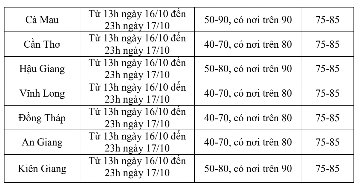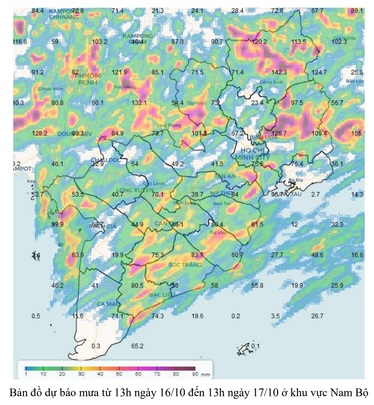 Lượng mưa ghi nhận từ 7h ngày 15/10 đến 7h ngày 16/10 một số nơi như: Sở Sao (Bình Dương): 58.6mm, Cái Bè (Tiền Giang): 59.2mm, Bù Nho 1 (Bình Phước): 67.4mm, Thới Sơn (An Giang): 96.8mm, Cái Nước (Cà Mau): 106.2mm, Châu Đốc (An Giang): 117mm,...