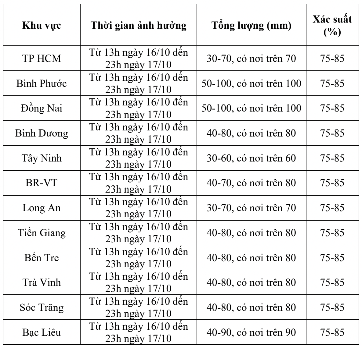 Dự báo từ hôm nay 16/10 đến ngày mai (17/10), khu vực Nam bộ có mưa nhiều nơi, rải rác mưa vừa và dông, có nơi mưa to đến rất to.
