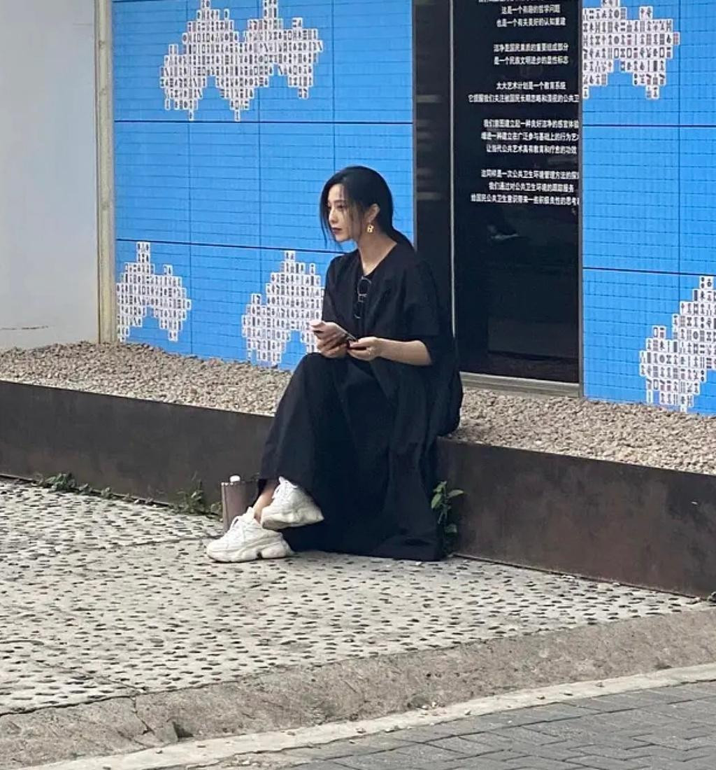 Trong ảnh, Phạm Gia lừng lẫy showbiz Hoa ngữ một thời mặc một bộ váy đen rất đơn giản, tóc buộc hững hờ và ngồi bệt bên lề đường. Không hề váy áo đồ hiệu lộng lẫy, chẳng trang điểm cầu kỳ, cũng chẳng xuất hiện giữa thảm đỏ hào nhoáng nhưng Phạm Băng Băng vẫn vô cùng nổi bật.