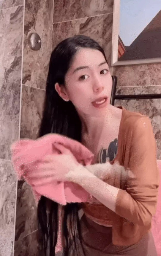 Lúc này, Hằng Du Mục mới chuyển sang bước gội đầu. Cô không cho thẳng dầu gội lên da đầu mà sẽ hòa dầu gội vào bát với một ít nước, đánh bông lên tạo bọt rồi mới bôi lên tóc. Công đoạn này sẽ giúp chân tóc không phải tiếp xúc trực tiếp với dầu gội, từ đó mà tóc bớt rụng hơn.