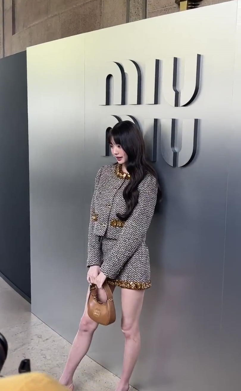 Chiều cao 1m73 cùng đôi chân dài miên man của Won Young được khoe triệt để trong outfit này. Nhan sắc của center IVE đang trở thành "đề tài nóng" trên nhiều diễn đàn bàn luận tại Hàn, hashtag #MiuMiuSS24xWONYOUNG cũng thăng hạng chóng mặt trên top thịnh hành của Twitter (X).