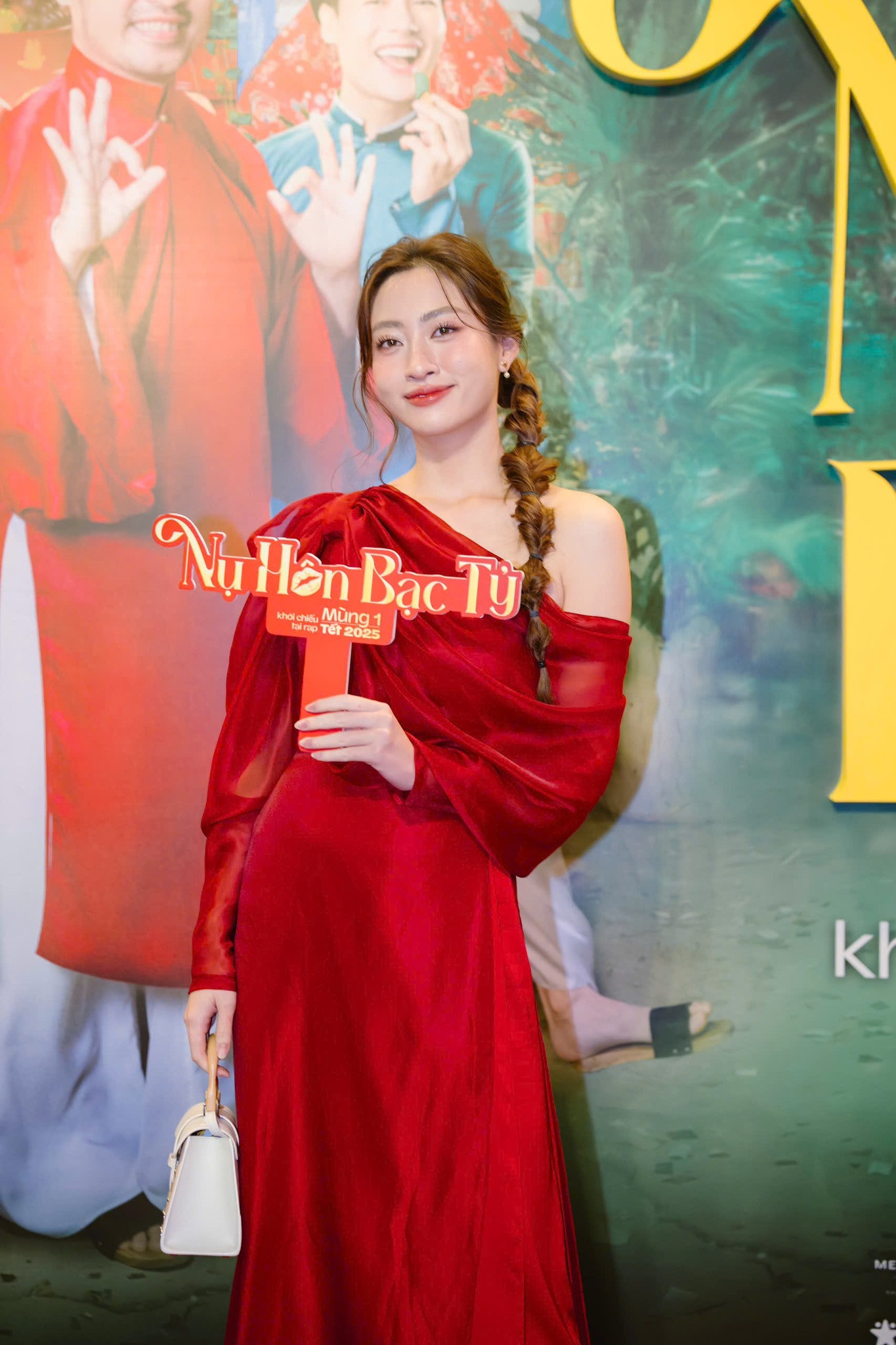 Lương Thùy Linh cũng nhanh chóng bắt kịp xu hướng tóc tết lệch khi diện áo dài với phần cổ độc đáo tới chúc mừng vai diễn mới của Đoàn Thiên Ân.