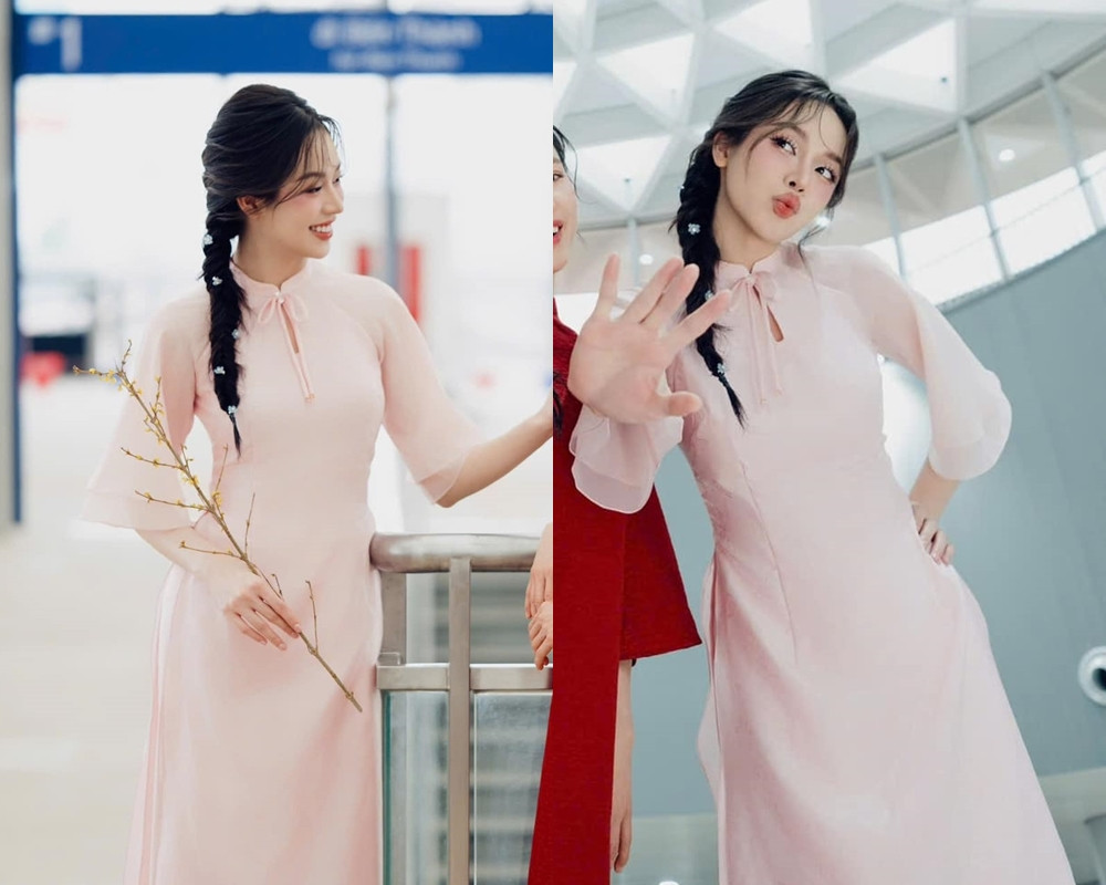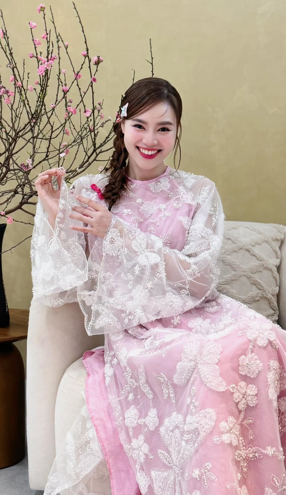 Sau màn khiến netizen giật mình vì tưởng nhuộm tóc vàng óng, Hoa hậu Thanh Thủy đã nhanh chóng quay trở về với mái tóc đen quen thuộc. Nàng hậu chọn bộ áo dài cách tân màu hồng nhạt cho bộ ảnh tiễn năm cũ, tết tóc lệch một bên càng thêm phần ngọt ngào.