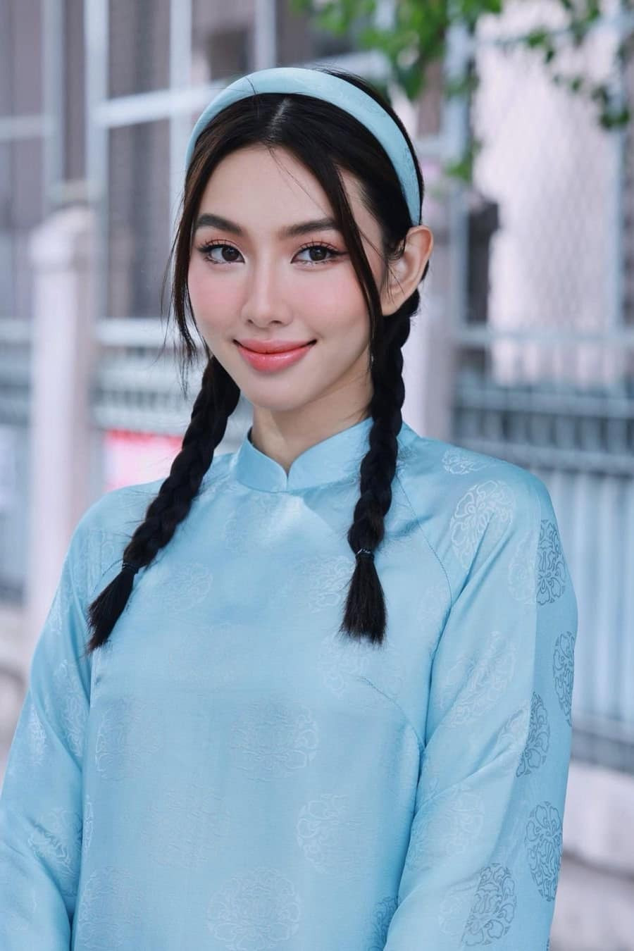 Ở Tết năm trước, Thùy Tiên từng gây sốt với bộ ảnh tết tóc hai bên, đeo thêm băng đô cùng màu với bộ áo dài xanh thiên thanh. Hiếm khi nàng hậu có tạo hình nhẹ nhàng, thanh nhã đến vậy nên khán giả vô cùng thích thú.