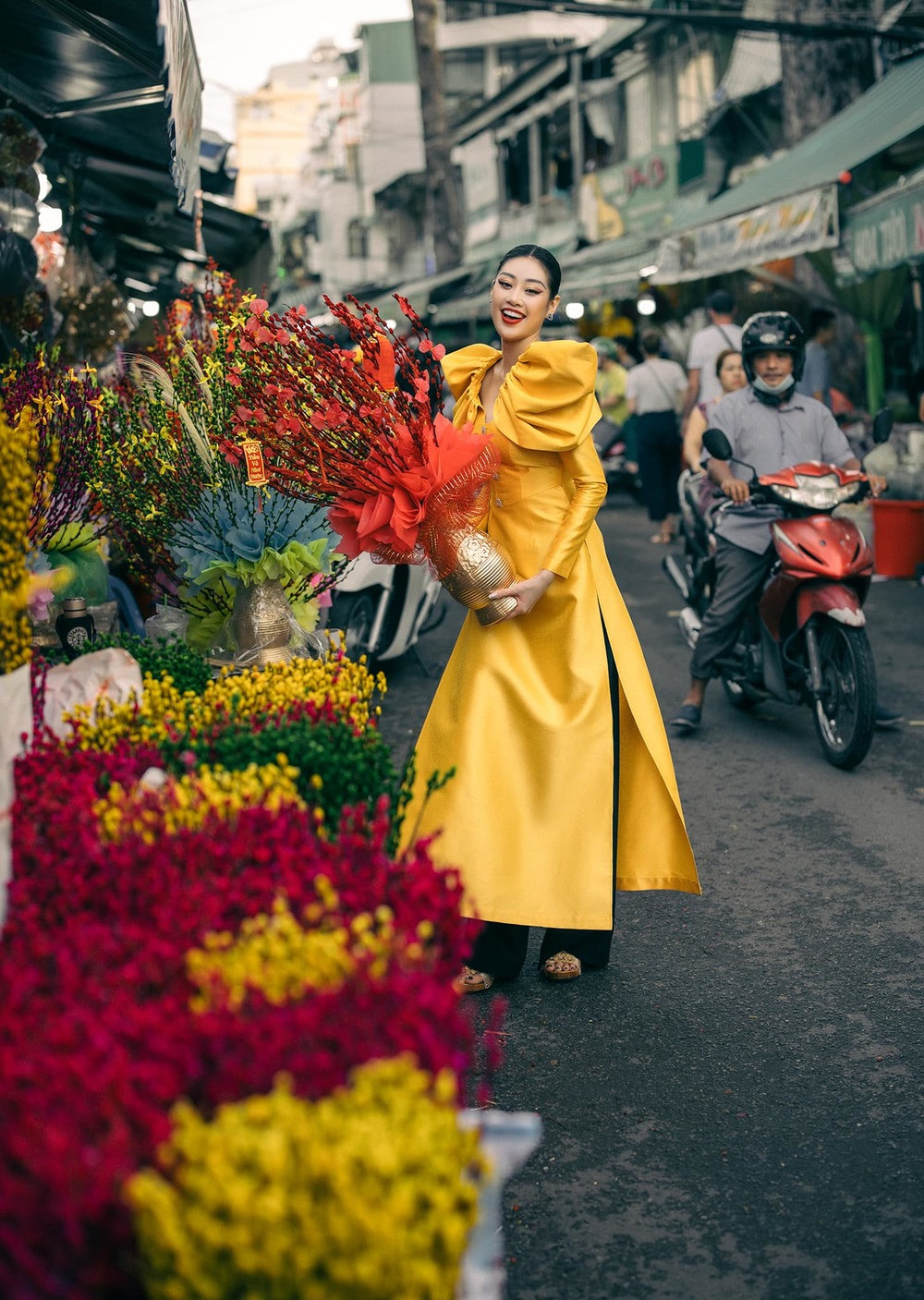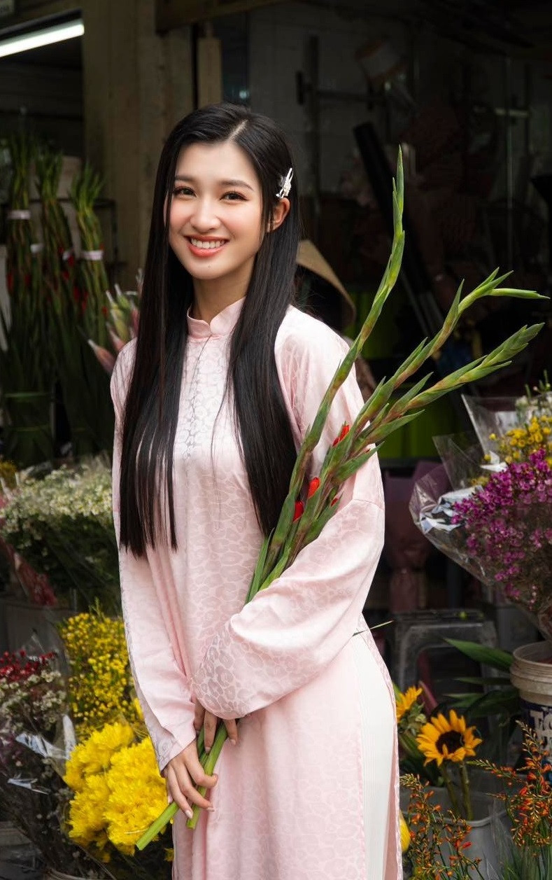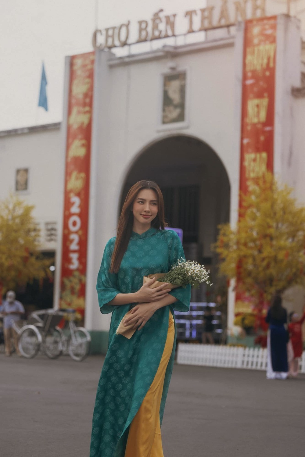Hoa hậu Thùy Tiên đã tới chợ Bến Thành để ghi lại loạt ảnh mang đậm không khí Tết. Chọn bộ áo dài nền nã màu xanh cổ vịt, thêm một bó hoa nhỏ xinh trên tay là Thùy Tiên đã hóa thân thành cô gái Việt đầy dịu dàng.