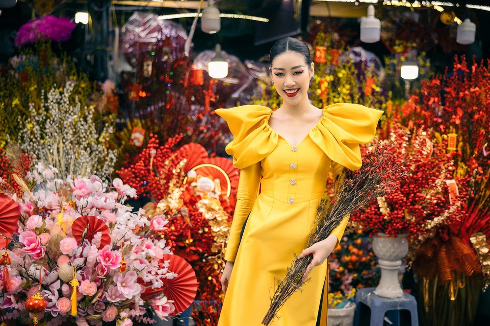 Hoa hậu Khánh Vân không chỉ chọn bộ áo dài vàng rực như nắng mà còn có phần tay bồng cách điệu vô cùng độc đáo. Lâu nay, Khánh Vân vẫn được khen là người đẹp áo dài và quả thực dù là kiểu truyền thống hay cách tân thì cô vẫn vô cùng xinh đẹp.