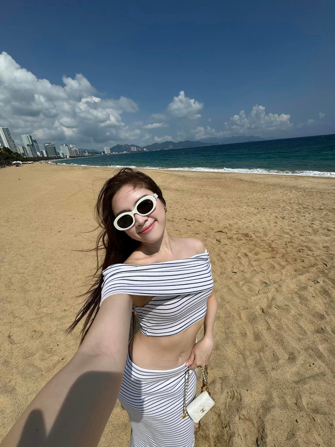 Trong loạt ảnh mới, nữ MC sinh năm 1996 được cư dân mạng khen ngợi với hình thể khỏe khoắn hậu Tết Giáp Thìn. Cô diện set trang phục kẻ sọc ngang khoe bờ vai thon, vòng eo săn chắc.