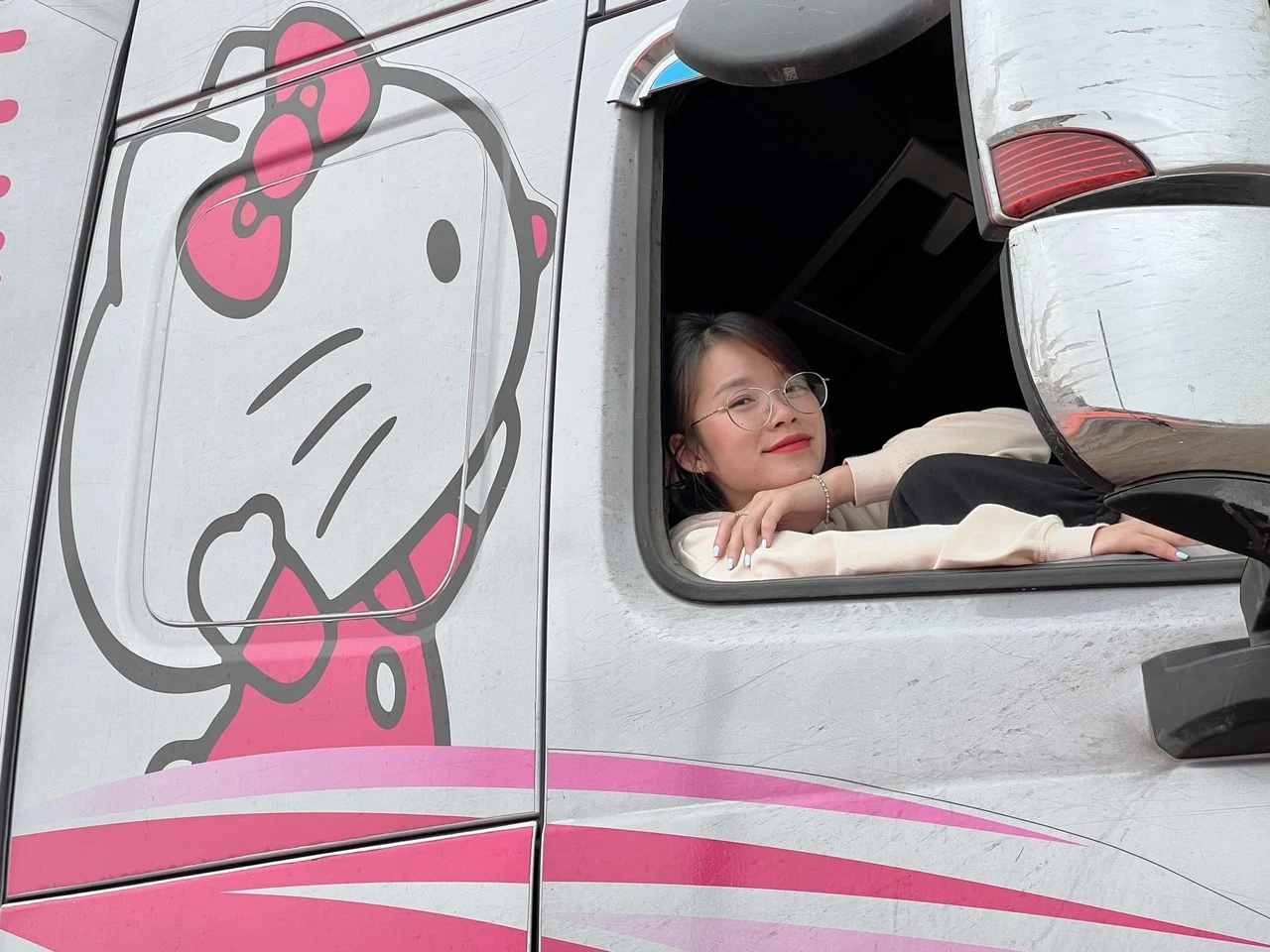Đặc biệt, Hạnh yêu thích màu hồng nên lựa chọn họa tiết mèo Hello Kitty, kèm nickname và ảnh cá nhân trang trí lên ‘con xe’. Cô cho biết: “Nhà mình có 2 xe tải, ban đầu định dán 2 xe đều màu hồng kèm mèo Hello Kitty. Nhưng bố bảo một xe sẽ thuê người lái, mà hầu hết là nam nên màu hồng nữ tính quá. Vì thế, mình nghĩ đến Doraemon, thêm màu xanh đáng yêu.