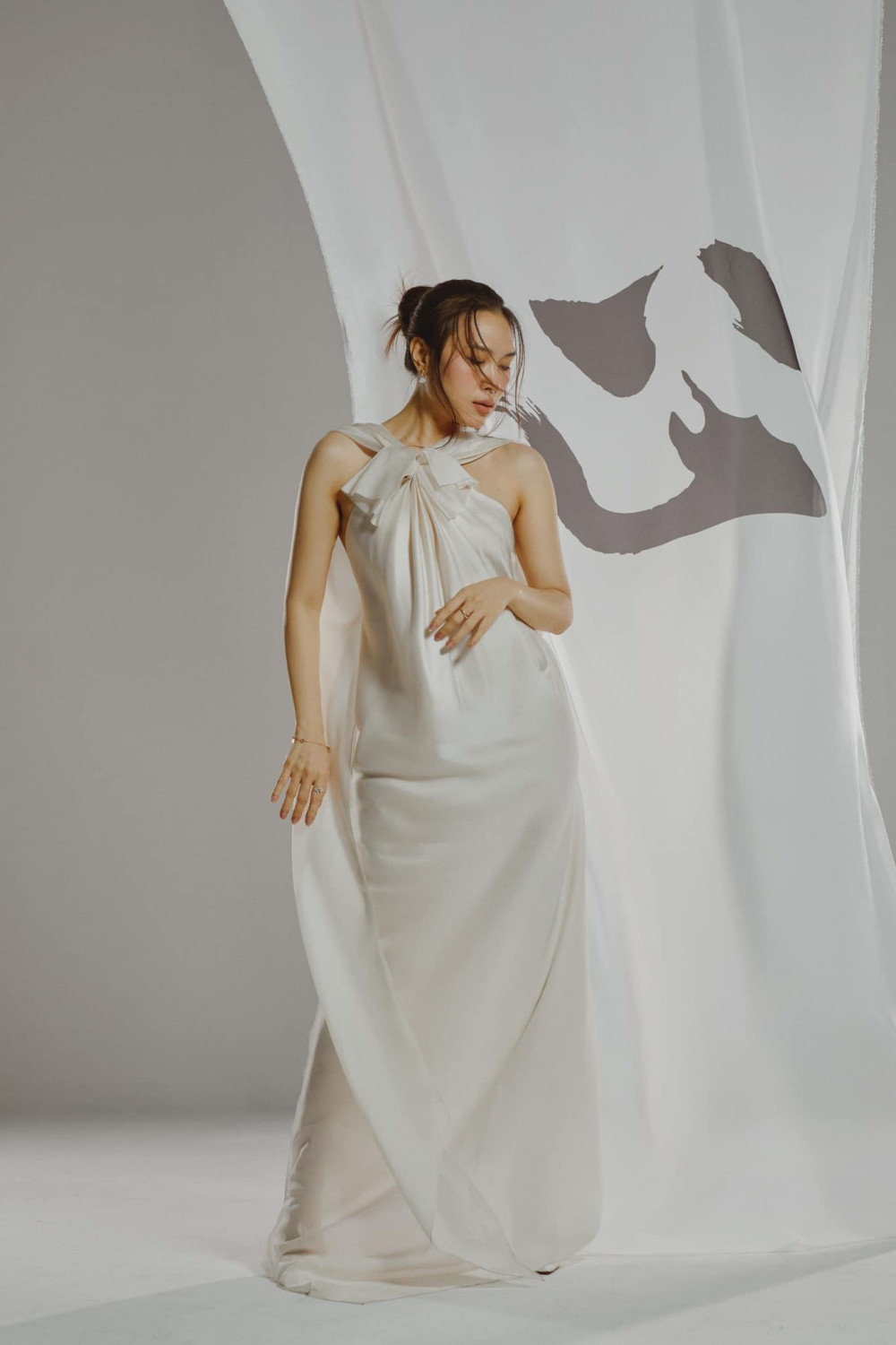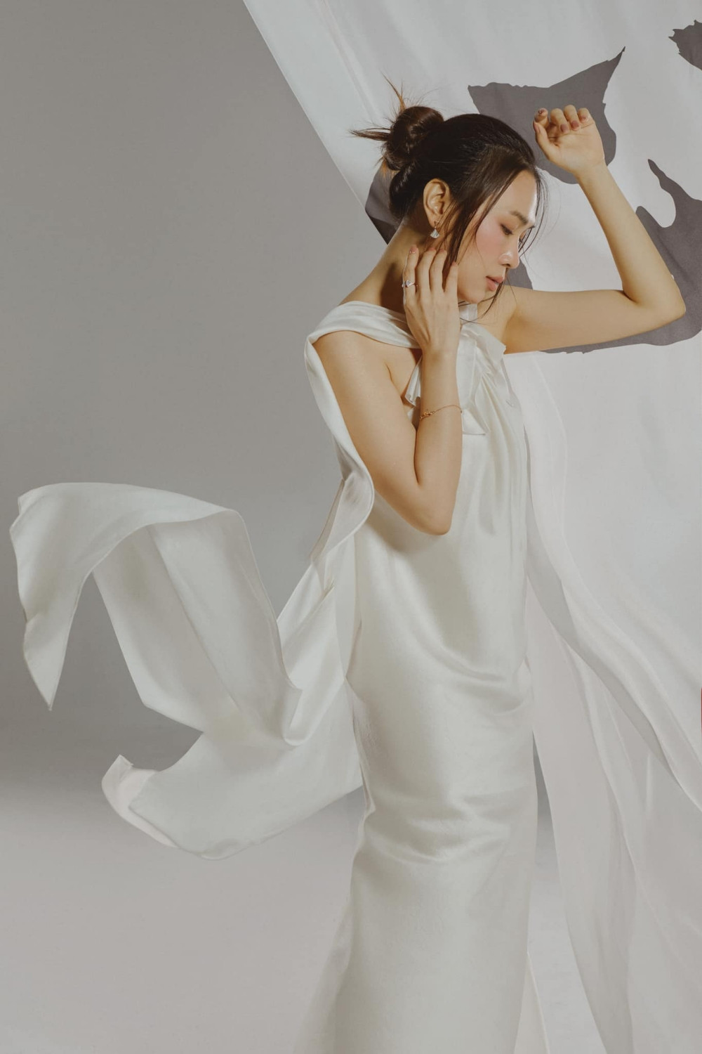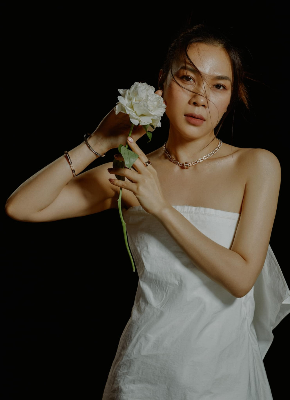 Trong loạt ảnh, nữ ca sĩ chỉ diện trang phục trắng, trong đó có một chiếc váy lụa trắng và một mảnh vải trắng thô được quây lại thành mẫu váy cúp ngực, khoe trọn bờ vai thanh mảnh.