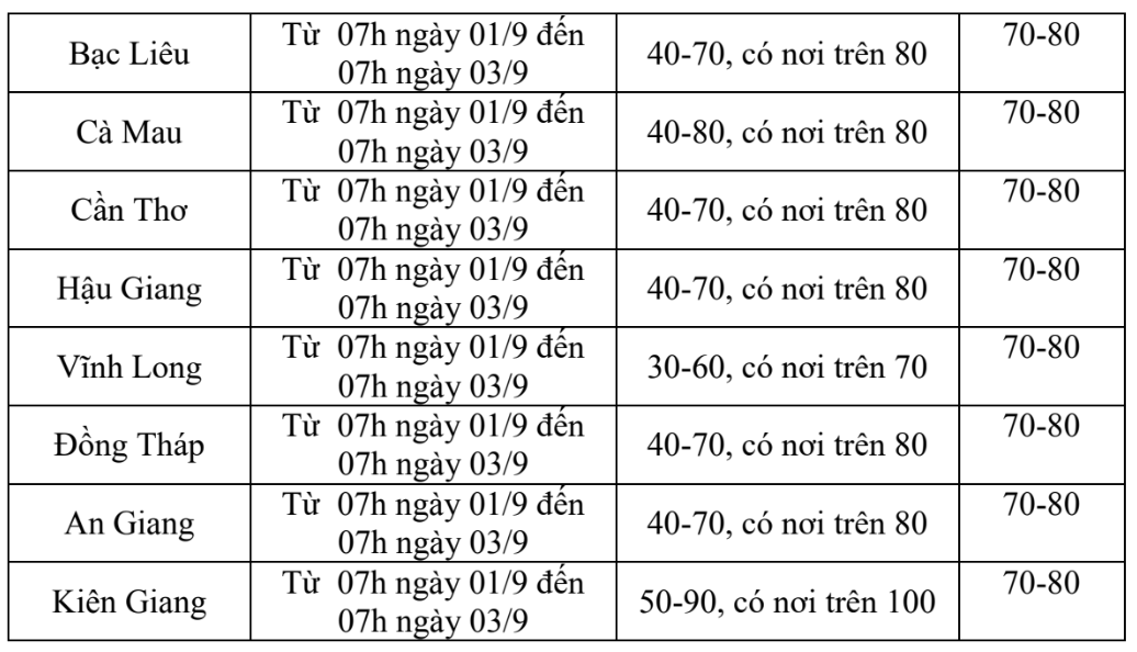 Ngoài ra, do ảnh hưởng của gió mùa Tây Nam hoạt động mạnh nên ngày và đêm nay 1/9, vùng biển từ Bà Rịa-Vũng Tàu đến Cà Mau, Cà Mau đến Kiên Giang (bao gồm Phú Quốc), vịnh Thái Lan và khu vực Nam Biển Đông (bao gồm cả vùng biển quần đảo Trường Sa) có mưa rào và dông. Trong mưa dông có khả năng xảy ra lốc xoáy và gió giật mạnh.