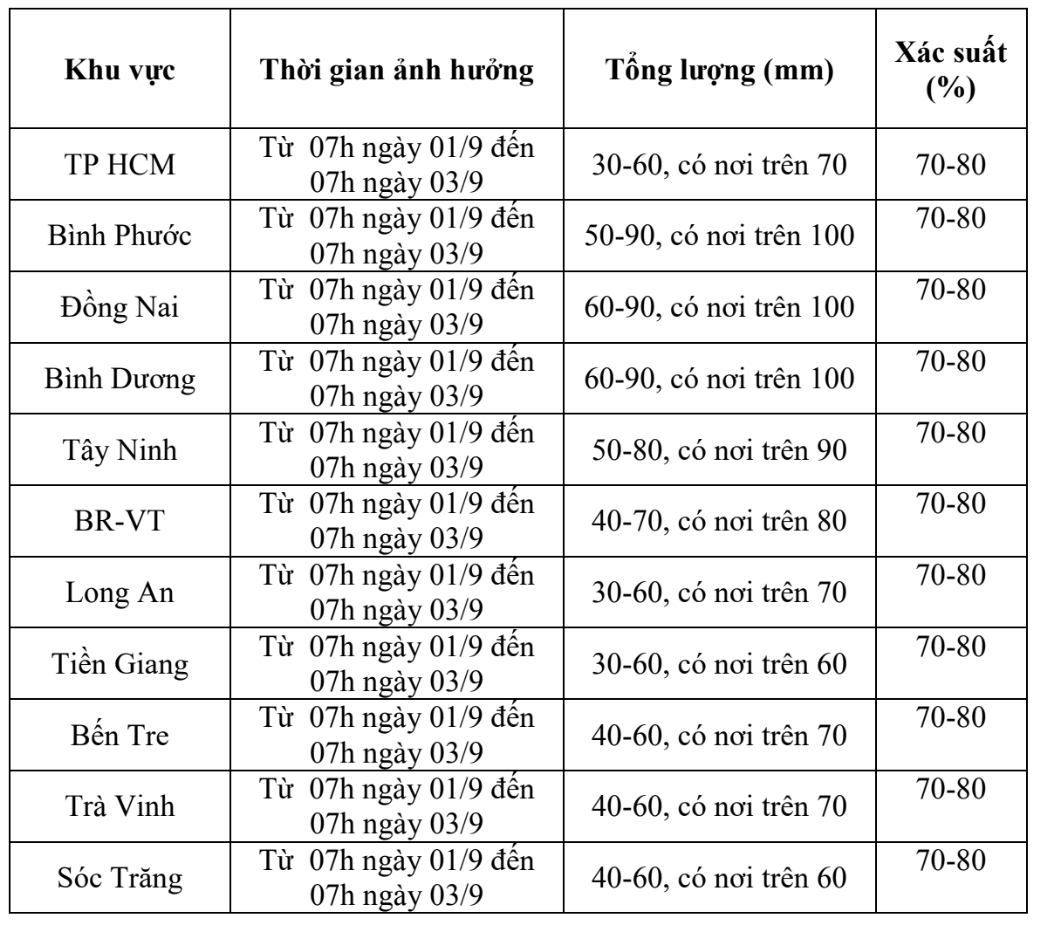 Từ ngày 1/9 đến ngày 3/9, khu vực Nam Bộ có mưa rào nhiều nơi, rải rác mưa vừa và dông, có nơi mưa to, cục bộ có mưa rất to.
