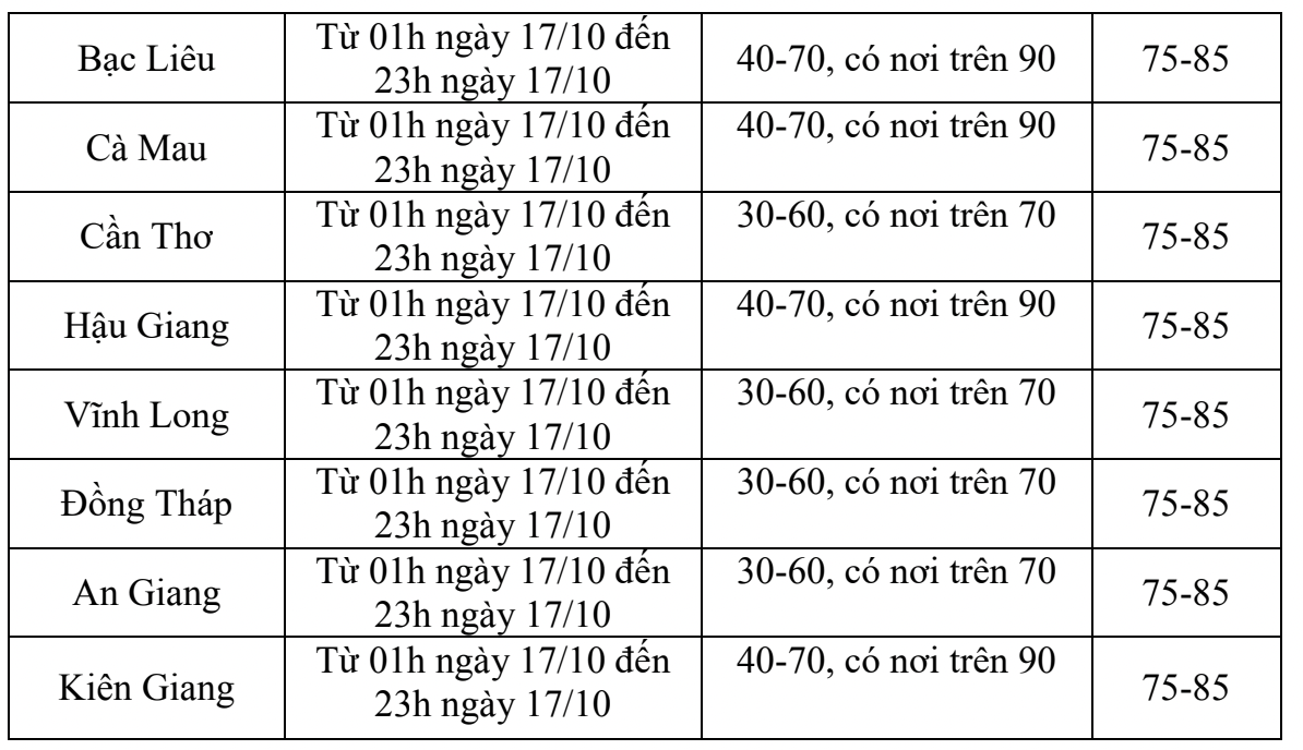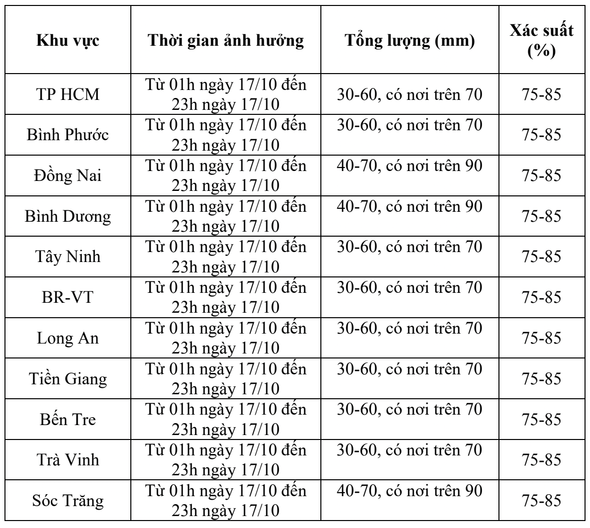 Dự báo, ngày và đêm nay (17/10), khu vực Nam Bộ có mưa nhiều nơi, rải rác mưa vừa và dông, có nơi mưa to đến rất to. Đợt mưa diện rộng trên khu vực Nam Bộ có khả năng kéo dài đến hết ngày 17/10. Trong mưa dông có khả năng xảy ra lốc, sét, mưa đá và gió giật mạnh. Cần đề phòng khả năng mưa lớn kết hợp với triều cường gây ngập ở các vùng trũng thấp, khu vực ven sông, ven kênh rạch.