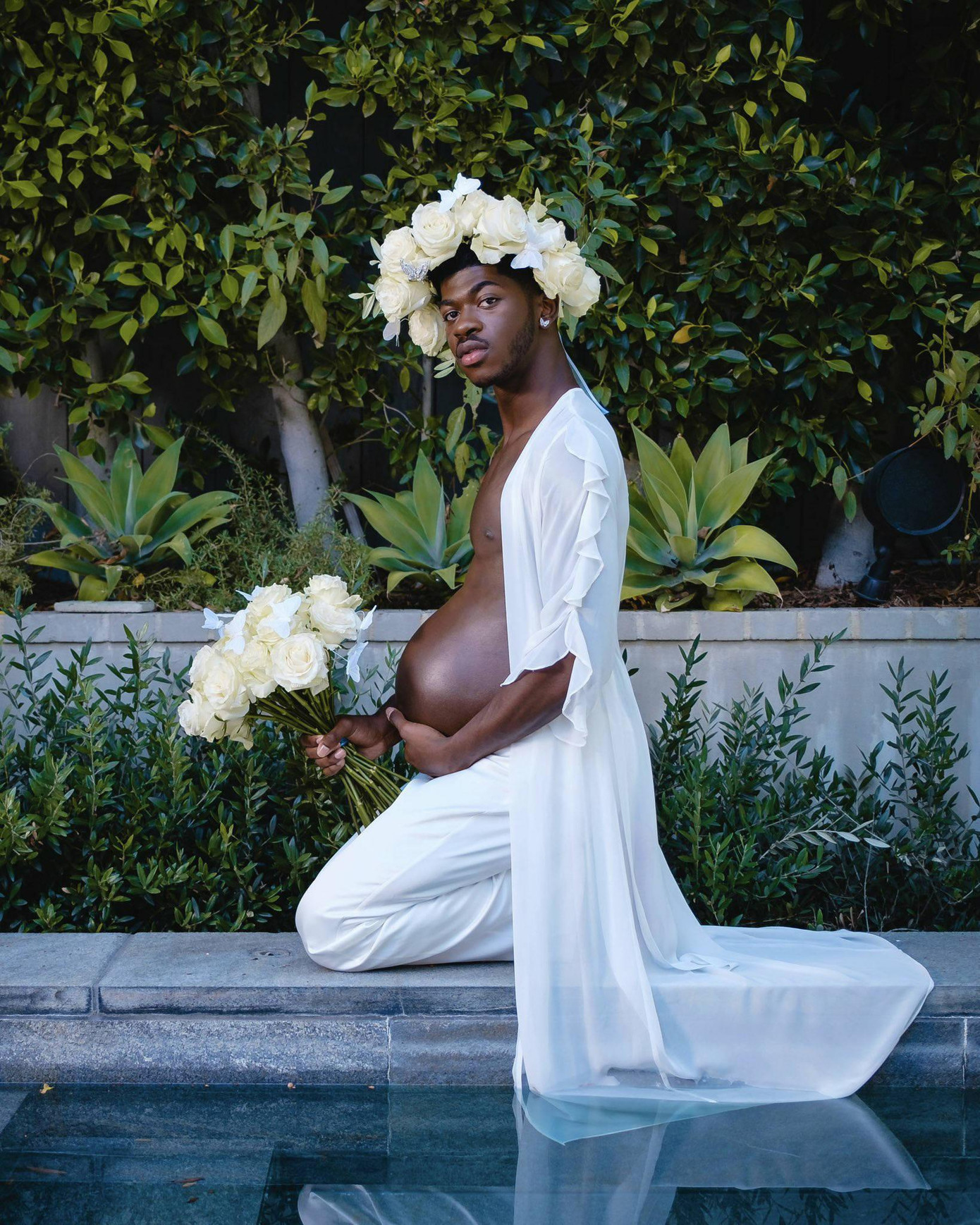 Ngày 3/9 trên trang cá nhân, Lil Nas X gây “sốc” với loạt ảnh khoe bụng bầu, đội vòng hoa.