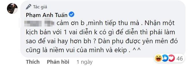 Không đồng tình với một số bình luận của khán giả, Phạm Anh Tuấn đáp trả khá gắt. Khi có cư dân mạng thắc mắc nam diễn viên vì sao không tiếp thu nhận xét mà lại đi thách thức ngược thì Phạm Anh Tuấn hỏi luôn người này liệu có diễn dở được như anh hay không? Nam diễn viên cũng hỏi ngược rằng tại sao anh lại phải nghe những lời góp ý khó nghe như vậy. Ở một bình luận khác, Phạm Anh Tuấn còn giải thích rằng anh nhận một vai diễn không có gì để diễn thì phải làm sao để vai hay hơn?